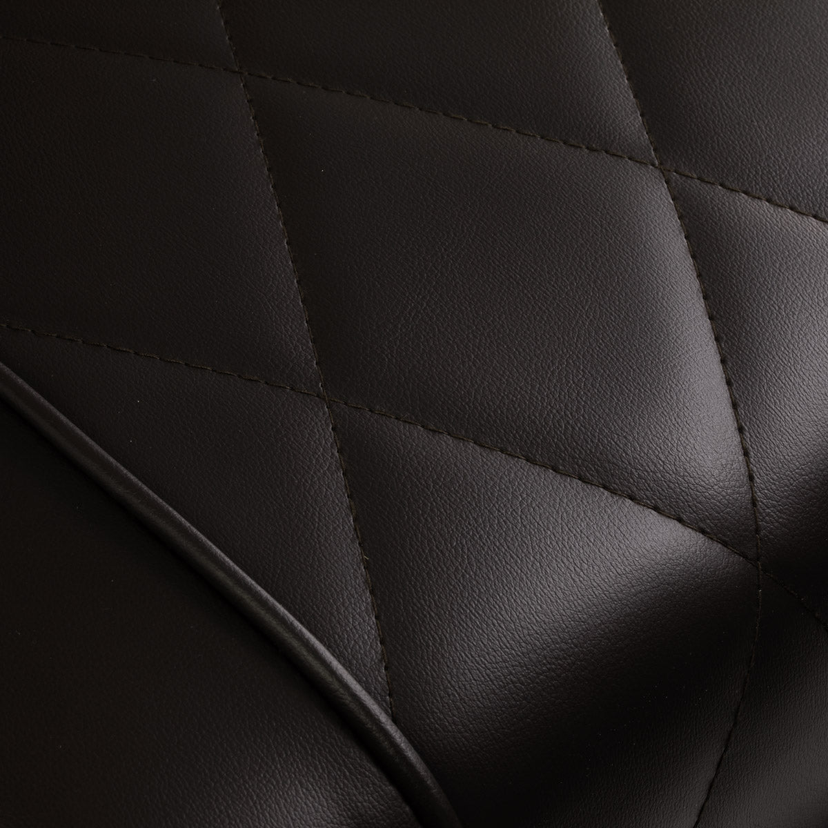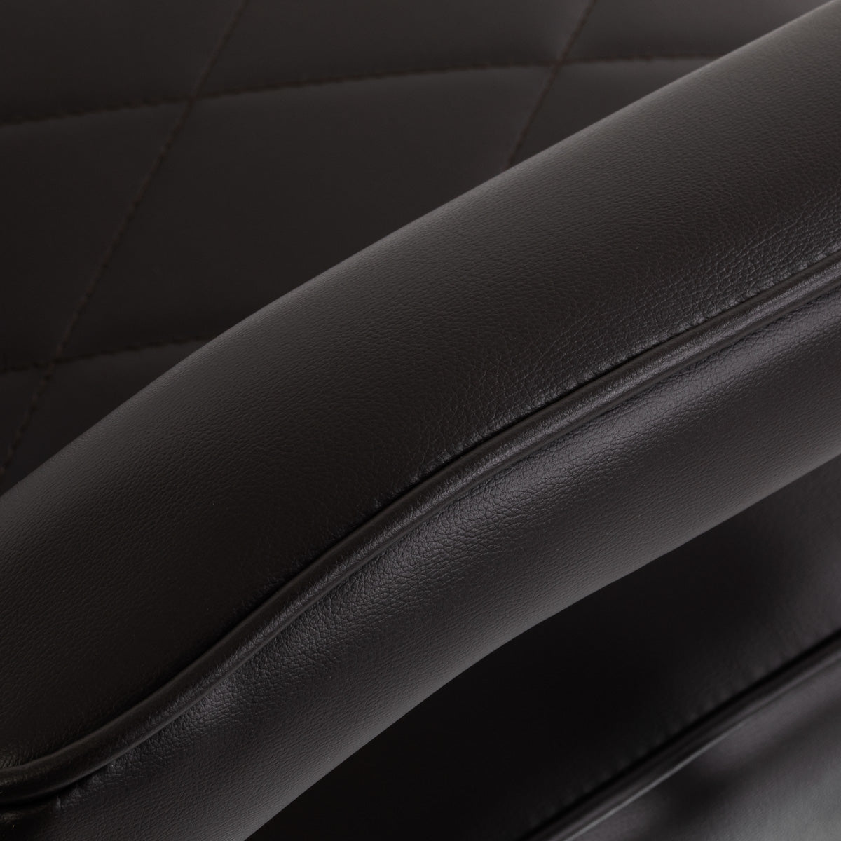 Die solide runde Basisstruktur des Stuhls sorgt für Stabilität und hervorragenden Benutzerkomfort. Die Sitzfüllung aus formbeständigem Schaumstoff und die Polsterung aus soft-touch Kunstleder mit matter Oberfläche garantieren langanhaltende Haltbarkeit und Komfort bei längerem Gebrauch. Stilvolle Nähte auf der Polsterung verleihen Charakter und erinnern an Automobildesigns, die sein elegantes Erscheinungsbild unterstreichen. Dieses Merkmal macht den Stuhl zudem feuchtigkeitsbeständig, langlebig und leicht zu reinigen. Die Polsterung in Brauntönen verleiht dem Stuhl einen einzigartigen Charakter, und sein minimalistischer Stil lässt ihn sich nahtlos in die Einrichtung jedes Barbershops einfügen.