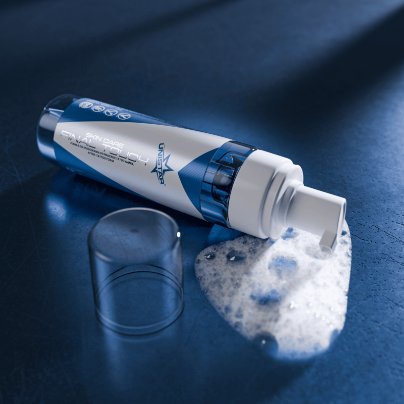 Unistar Skin Care Final Touch ist ein professioneller Schaumschaumreiniger, der für die letzte Phase des Tätowierprozesses entwickelt wurde. Er entfernt Tintenreste, Vaseline und andere Produkte, ohne die natürliche Hydrolipidbarriere der Haut zu stören.