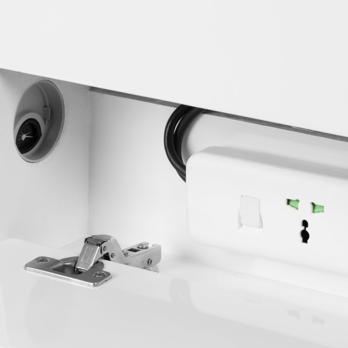 Ein hochwertiger Podologiehelfer ist ein funktionales, kosmetisches Möbelstück auf Rollen. Dank seiner Mobilität können Sie ihn in andere Behandlungsräume transportieren. Der Assistent verfügt über eine Glasarbeitsplatte, Schubladen für Werkzeuge, Zubehör und ein Fach für eine Podologiefraesmaschine oder ein anderes Gerät. Eine Schublade ist mit einer integrierten UV-C-Lampe für bessere Sterilität von Werkzeugen und Zubehör ausgestattet.