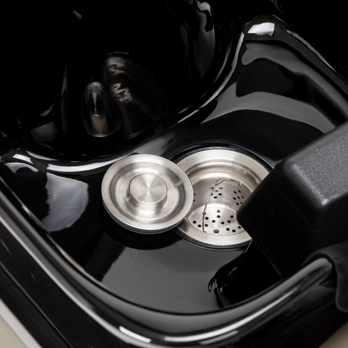 Die Keramikschale in Schwarztönen mit ihrer modernen Form und angemessenen Tiefe verhindert effektiv das Spritzen von Wasser und während der Behandlungen verwendeten Produkten, was eine komfortable und effektive Durchführung einer Vielzahl von Dienstleistungen ermöglicht. Der richtig profilierte Kragen und die geneigte Rückenlehne bieten Komfort und Unterstützung beim Haarewaschen, während die schwarze Kunststoffabdeckung den Kunden vor der kalten Keramikoberfläche schützt und ein angenehmes Erlebnis während der Behandlung sicherstellt.