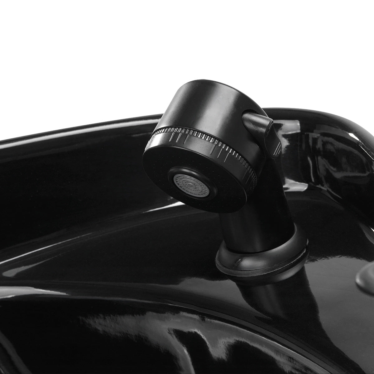 Die schwarze Keramikwaschschale mit entsprechender Tiefe verhindert übermäßiges Spritzen von Wasser und verwendeten Produkten während der Behandlung und ermöglicht eine komfortable Durchführung eines breiten Dienstleistungsspektrums. Die Möglichkeit, den Winkel der Schale einzustellen, erlaubt die Anpassung an individuelle Bedürfnisse. Das verwendete Material macht das Waschbecken langlebig, flecken- und kratzfest sowie sehr leicht zu reinigen. Ein richtig profiliertes Halsband bietet Halt und Komfort beim Haarewaschen, und mit der bequemen Kunststoffabdeckung spürt der Kunde nicht die Unannehmlichkeiten der kalten Keramikoberfläche.