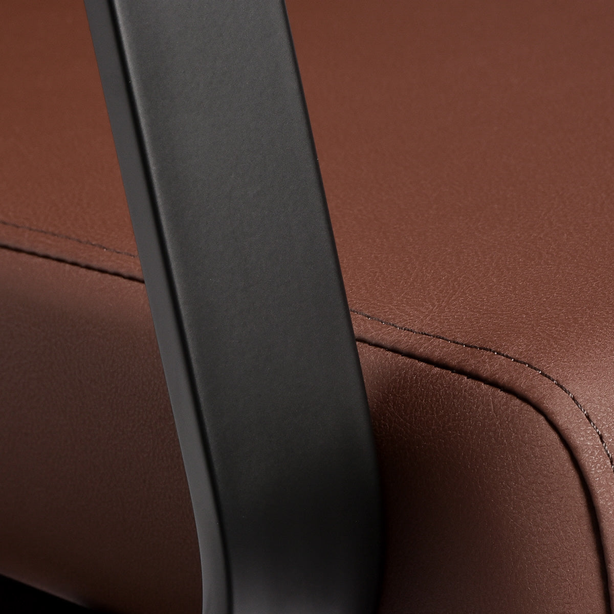 Der profilierte Stuhl bietet angemessene Lendenwirbelstütze und damit hohen Nutzungskomfort. Metallarmlehnen in Schwarztönen mit geometrischer Form ermöglichen die korrekte Positionierung der Schultern des Kunden. Die Füllung aus langlebigem, verformungsbeständigem Schaumstoff und die Polsterung aus angenehm zu berührendem Kunstleder in Brauntönen gewährleisten Langlebigkeit der Möbel, leichte Reinigung und komfortable Nutzung über lange Zeit. Das originelle, elegante Erscheinungsbild der Haarwascheinheit verleiht dem Innenraum einen einzigartigen Ausdruck. Das Set enthält komplette Armaturen in Schwarztönen, einschließlich eines Wasserhahns, eines Duschkopfs und spezieller Schläuche, um ein komplettes Arbeitswerkzeugset bereitzustellen.