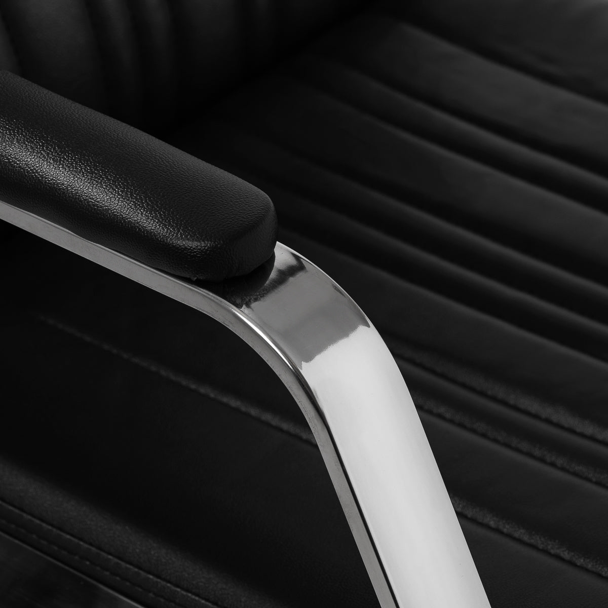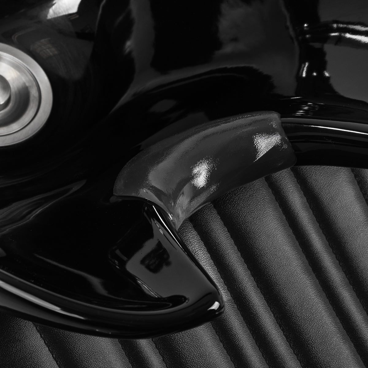 Die profilierte Sitzfläche, gefüllt mit langlebigem Schaumstoff, sorgt für Komfort, während die gepolsterten Armlehnen eine korrekte Positionierung der Schultern des Kunden erleichtern. Die Rückenlehne, die in einem optimalen Winkel angebracht ist, fördert eine ausgezeichnete Unterstützung der Wirbelsäule. Der Bezug aus Kunstleder in Schwarztönen garantiert Langlebigkeit und einfache Reinigung. Stilvolle Nähte auf der Polsterung verleihen dem Haarwaschbecken einen vom Automobildesign inspirierten Charakter und betonen sein beeindruckendes Erscheinungsbild. Es wird mit komplettem Beschlag in Chrom- und Schwarztönen geliefert, einschließlich Wasserhahn, Duschkopf und speziellen Schläuchen, um ein vollständiges Werkzeugset für die Arbeit zu gewährleisten.