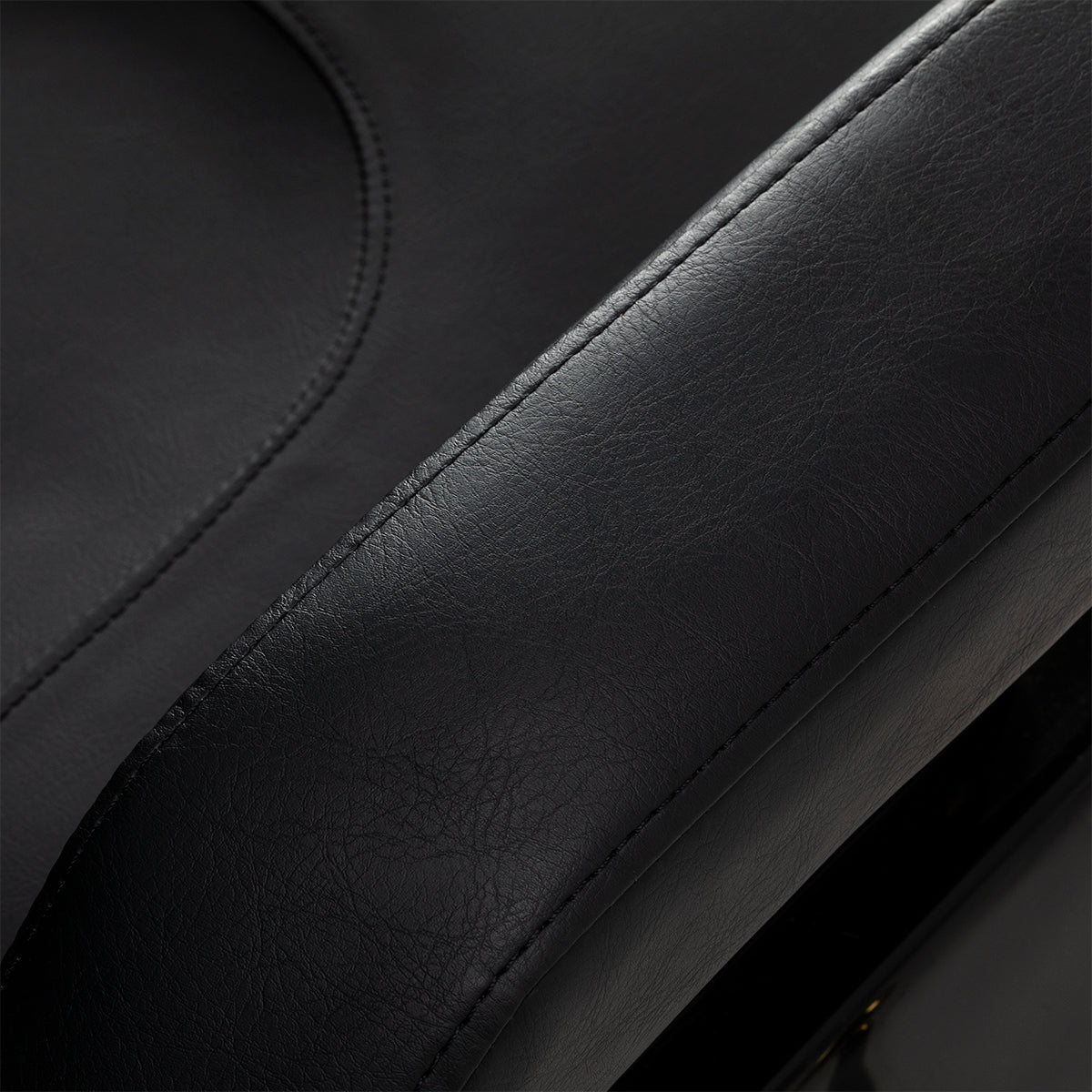 Die stabile runde Basis in Goldoptik verleiht dem Stuhl ein markantes Aussehen und garantiert Stabilität bei der Arbeit. Sitz, Rückenlehne und Fußstütze sind mit formstabilem Schaumstoff gefüllt und mit schwarzem, angenehm zu berührendem Kunstleder bezogen, was Langlebigkeit und hohen Komfort gewährleistet. Die feuchtigkeitsresistente und pflegeleichte Oberfläche macht den Stuhl perfekt für den täglichen Gebrauch. Die goldenen Details und die markanten Linien der Polsterung betonen den exklusiven Charakter der Möbel und verleihen ihm einen modernen, leicht automobilen Stil. Das elegante Design fügt sich perfekt in die Einrichtung von Barbershops ein.