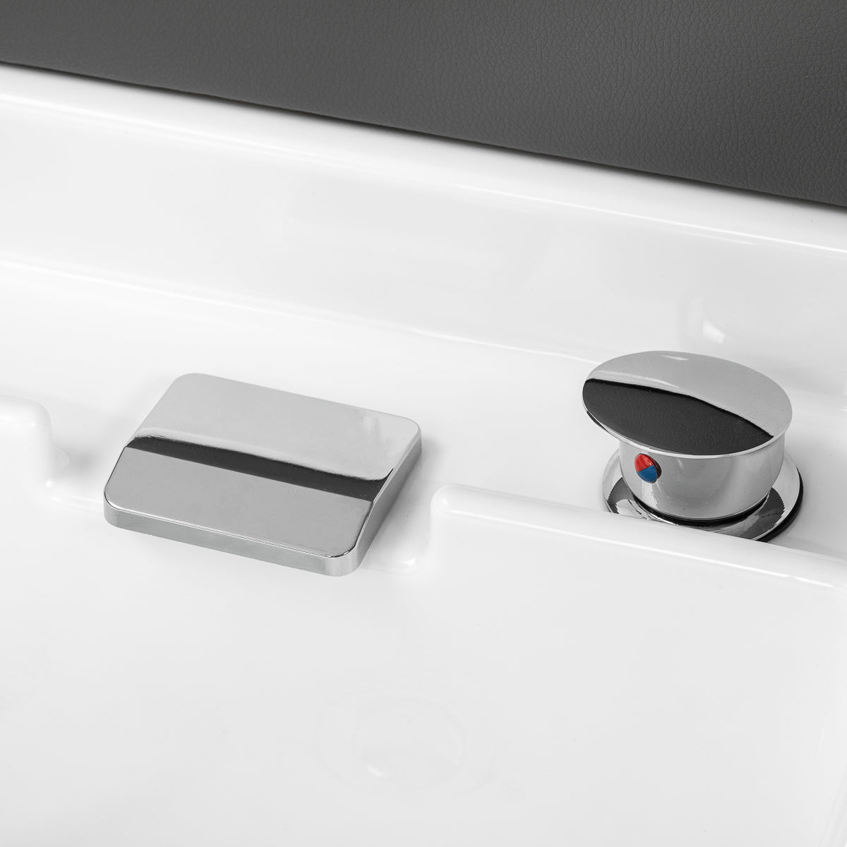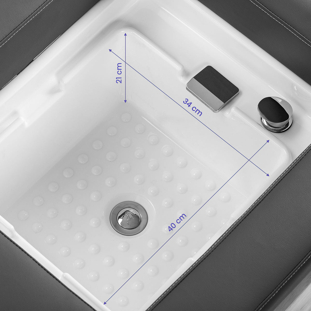 Die Wascheinheit ist mit einem Mischbatteriehahn ausgestattet, der eine einfache Temperatureinstellung nach Kundenwunsch ermöglicht. Ein praktischer Platz für den Duschkopf erleichtert die Arbeit, während ein Stöpsel mit speziellem Sieb die Wasserflusskontrolle und die Einhaltung hoher Hygienestandards im Salon gewährleistet. Der Wasseranschluss befindet sich innen unter der Schale und hinten unter der Duschwanne und verbirgt die Installation ästhetisch. Die ergonomisch geformte Liege bietet Komfort und ausreichende Unterstützung während der Behandlungen, und der mitgelieferte Pouf erhöht den Komfort des Personals. Die Kombination aus Funktionalität und Bequemlichkeit macht diese Wascheinheit zu einem vielseitigen Ausstattungsstück für Friseursalons und SPA-Bereiche.