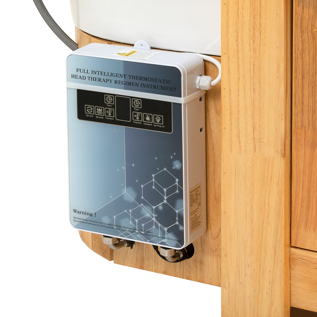 Das intuitive Touchpanel ermöglicht die vollständige Kontrolle über die Behandlungsparameter und sorgt für einfache Bedienung. Es erlaubt die Einstellung der Betriebszeit und Wassertemperatur sowie die Echtzeitüberwachung der Einstellungen. Das Panel ermöglicht außerdem die Aktivierung der Lichttherapie – das Licht im Becken schafft eine entspannende Atmosphäre und verstärkt das luxuriöse Gefühl der Behandlung. Zusätzlich ist das Dampfanwendungsgerät mit einer Fernbedienung für bequeme Bedienung ausgestattet.