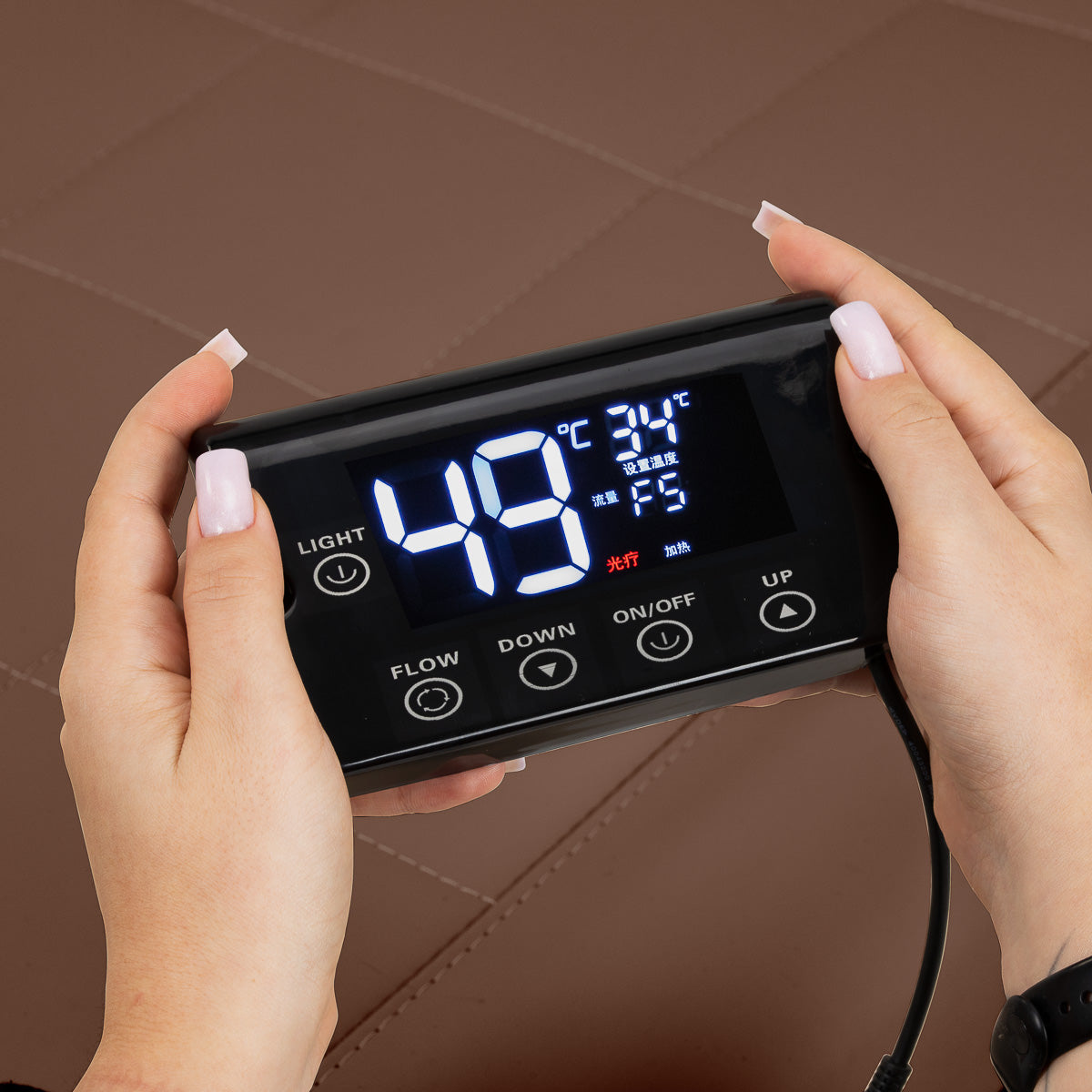 Das intuitive Touch-Bedienfeld ermöglicht die vollständige Kontrolle über die Behandlungsparameter und eine einfache Bedienung. Es erlaubt die Einstellung der Betriebszeit und Wassertemperatur sowie die Überwachung der aktuellen Werte auf einem klaren, gut lesbaren Display. Zusätzlich kann über das Bedienfeld die Lichttherapiefunktion aktiviert werden, die die Schüssel beleuchtet und eine Atmosphäre der Entspannung und des Luxus schafft. Das Set enthält außerdem eine Fernbedienung, mit der das Dampftherapiegerät bequem aus der Entfernung gesteuert werden kann.