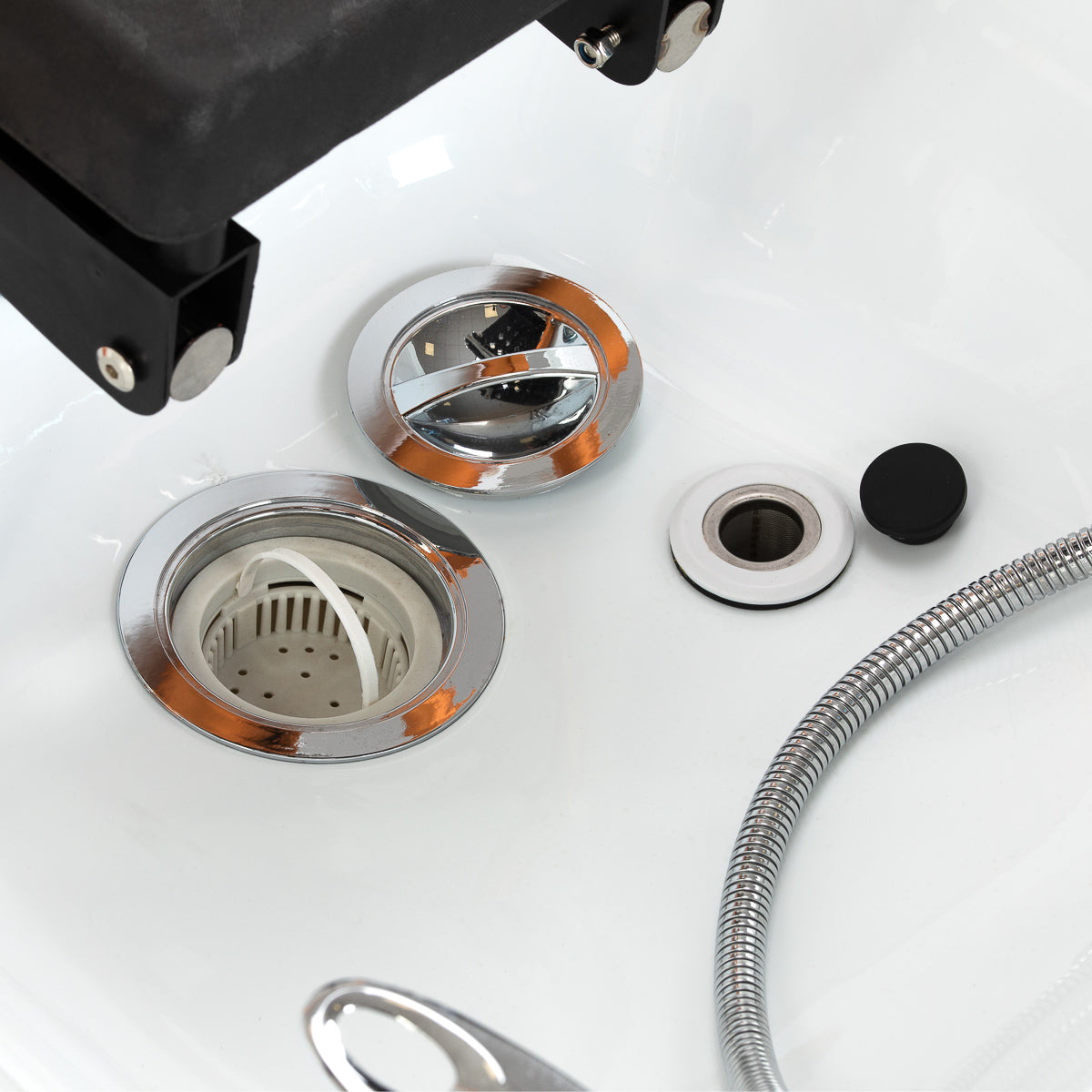 Die Wascheinheit ist mit einem Mischbatteriehahn ausgestattet, der eine präzise Einstellung der Wassertemperatur an die Bedürfnisse des Kunden ermöglicht. Ein spezieller Platz für den Duschkopf verbessert die Effizienz, während ein verchromter Stöpsel mit speziellem Sieb den Wasserfluss kontrolliert und ein hohes Hygieneniveau aufrechterhält. Der Wasseranschluss befindet sich im Inneren der Basis, hinter dem Stoff, versteckt die Rohrleitungen ästhetisch und verleiht der gesamten Einheit ein elegantes Aussehen. Das ergonomisch geformte Bett gewährleistet Komfort bei verschiedenen Schönheitsbehandlungen. Ein praktischer Hocker ergänzt die Einheit, erhöht den Komfort des Personals und verbessert die Funktionalität der Einheit. Diese Merkmale machen die Wascheinheit ideal für Haar- und SPA-Salons.