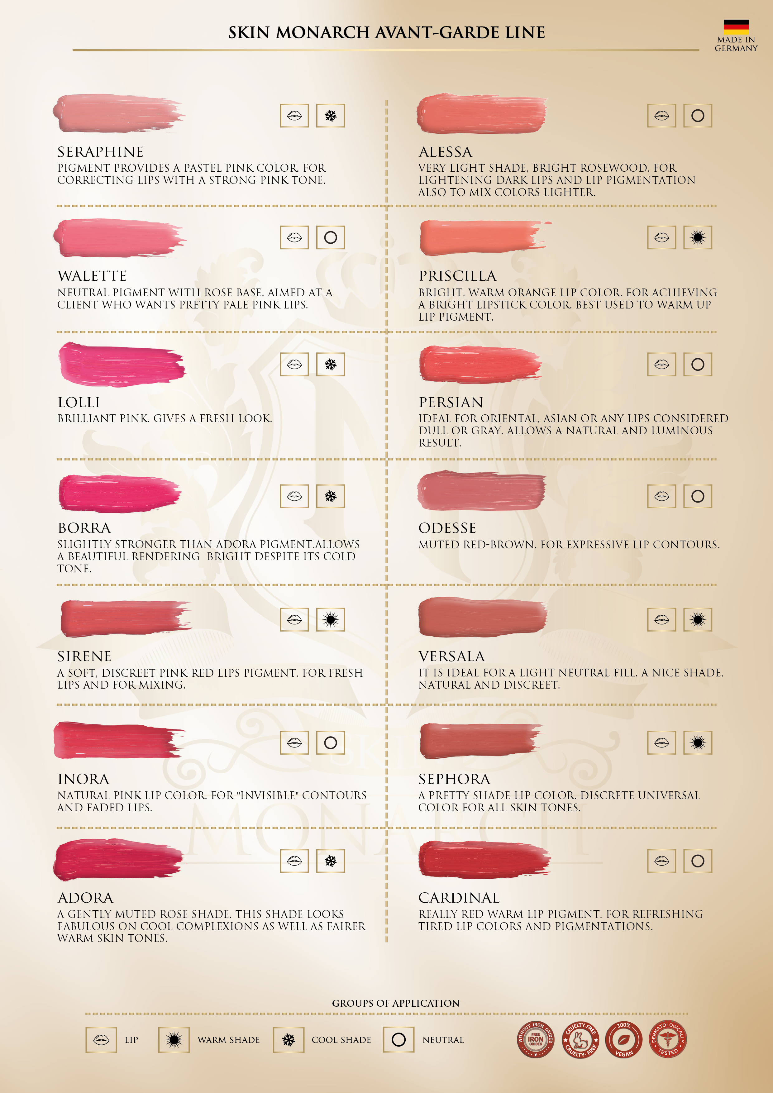 Formuliert von der Skin Monarch Academy, bestehen diese hochwertigen Avant-Garde Line Pigmente aus den weltweit besten zertifizierten Inhaltsstoffen. Frei von Eisenoxiden und vollständig farbstabil bieten sie außergewöhnliche Leistung, langanhaltende Farbe und gleichmäßiges Verblassen über die Zeit.