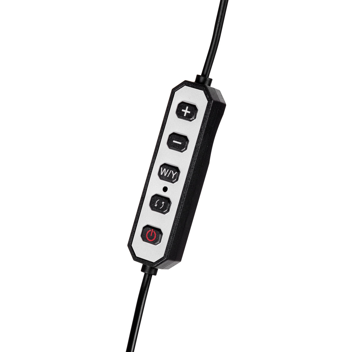Das Gestell ist leicht im Bereich von 140-180 cm verstellbar mittels einer Verriegelungsschraube am Arm. Dies ermöglicht die Anpassung der Kopfposition an individuelle Bedürfnisse und verschiedene Arten von Kosmetikstühlen, Liegen oder Behandlungstischen und gleichzeitig eine perfekte Ausleuchtung des Arbeitsbereichs. Farbe und Intensität des Lichts können stufenlos mit Fernbedienungen eingestellt werden – eine befindet sich direkt neben der Lampe, sodass sie während der Arbeit immer griffbereit ist; die zweite ermöglicht die Steuerung der Einstellungen aus der Entfernung.