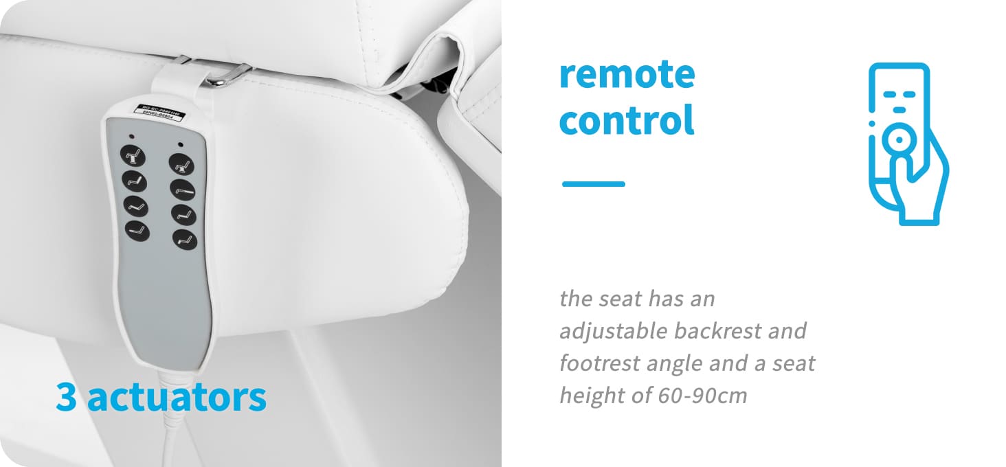 Die kabelgesteuerte Fernbedienung ermöglicht präzise Positionierung des Stuhls in drei Ebenen: Höhenverstellung, Rückenlehnenwinkelverstellung und Schaukelstuhl-Einstellung. Dieser Verstellbereich erlaubt die Positionierung entsprechend der Art des Verfahrens – sowohl hinsichtlich des Komforts des Kunden als auch der Ergonomie des Anwenders. Für den Benutzerkomfort kann die Fernbedienung an den Halterungen aufgehängt werden, die auf beiden Seiten des Sitzes angebracht sind.