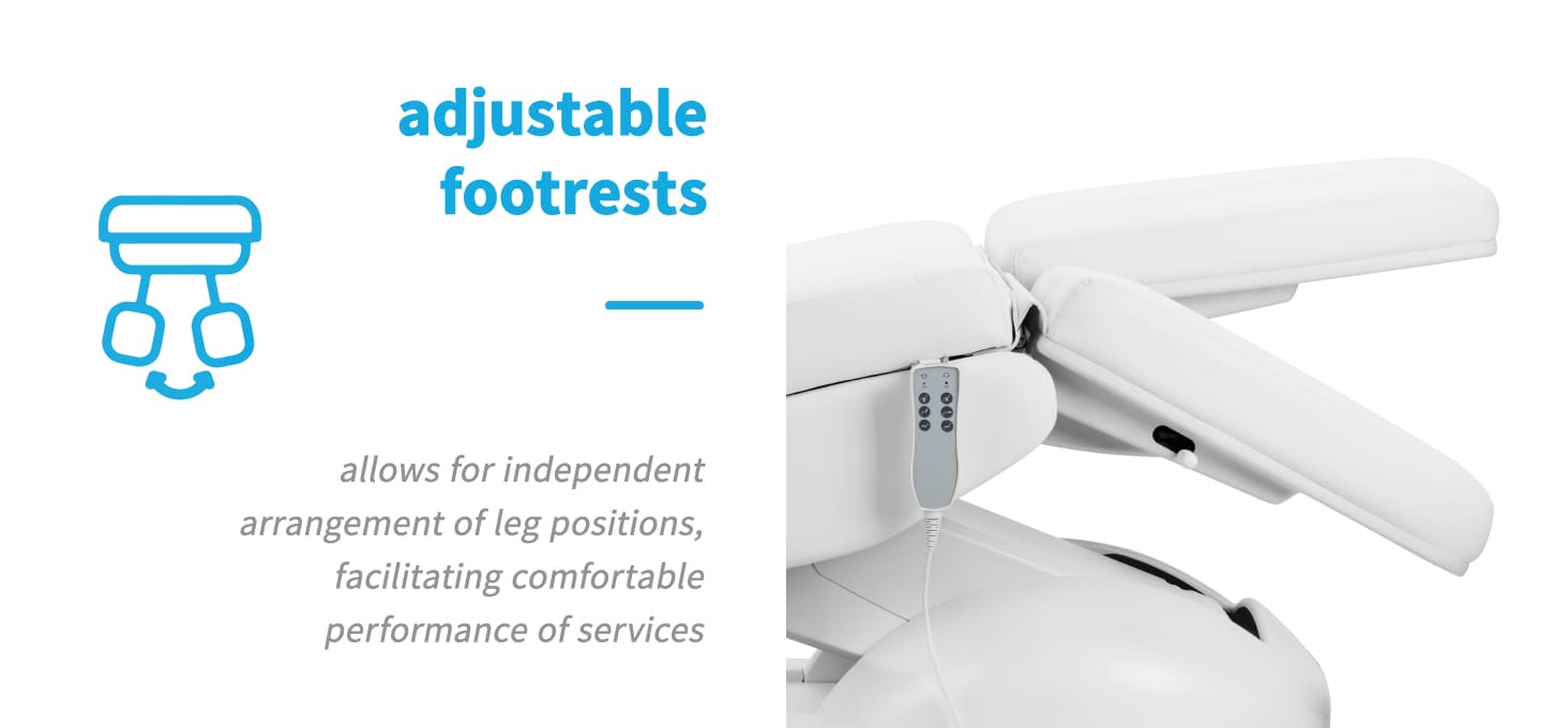 Der Stuhl wurde sorgfältig mit Blick auf Podologie-Profis entwickelt. Die geteilte Fußstütze ermöglicht die unabhängige Einstellung jedes Beins und erleichtert so eine präzise und komfortable Behandlung erheblich. Der Winkel jeder Seite wird manuell eingestellt, was eine schnelle Anpassung der Position an die Bedürfnisse von Kunde und Anwender erlaubt.