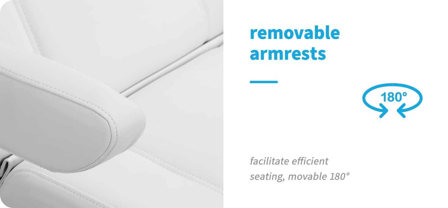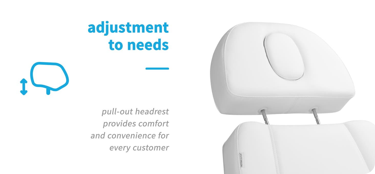 Der breite Sitz gewährleistet Komfort auch bei langen Behandlungen. Die leicht abnehmbaren, beweglichen Armlehnen mit 180°-Drehung erleichtern dem Kunden das Einsteigen in den Stuhl und bieten dem Anwender einfachen Zugang. Der Stuhl verfügt außerdem über eine verstellbare Kopfstütze, die eine stabile Kopfstütze und zusätzlichen Komfort, insbesondere für größere Nutzer, gewährleistet.