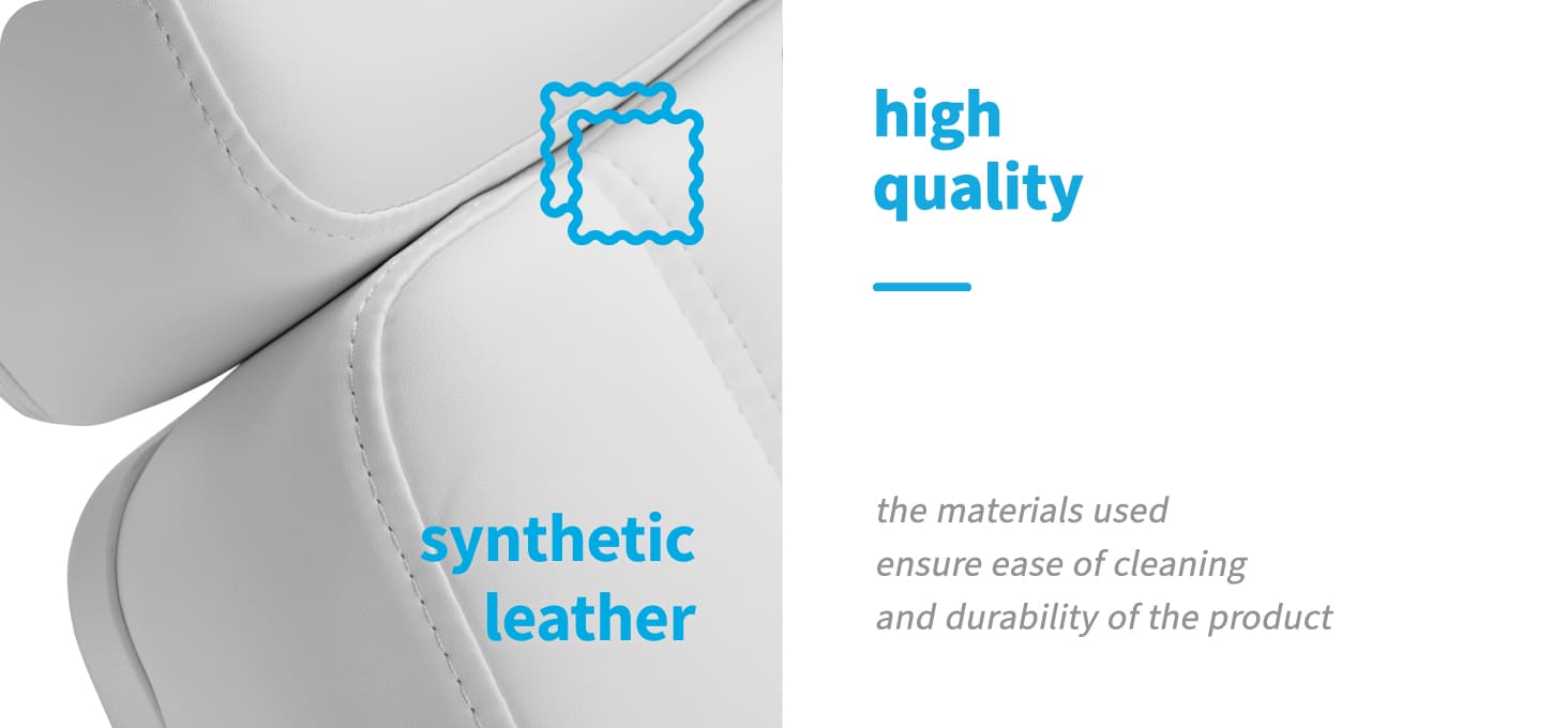 Die solide Konstruktion des Stuhls gewährleistet Stabilität und Langlebigkeit bei der täglichen Nutzung. Der Sitz, gefüllt mit Schaumstoff der entsprechend ausgewählten Härte, garantiert Komfort auch bei langen Behandlungen. Die Polsterung aus hochwertigem, angenehm zu berührendem Kunstleder in Weißtönen verleiht dem Stuhl ein professionelles Aussehen und ist dabei feuchtigkeitsbeständig und leicht zu reinigen. Die langlebige Basis sorgt für Stabilität, und die präzisen Ausführungen betonen den modernen Charakter des Stuhls und verbessern die Sitzergonomie.
