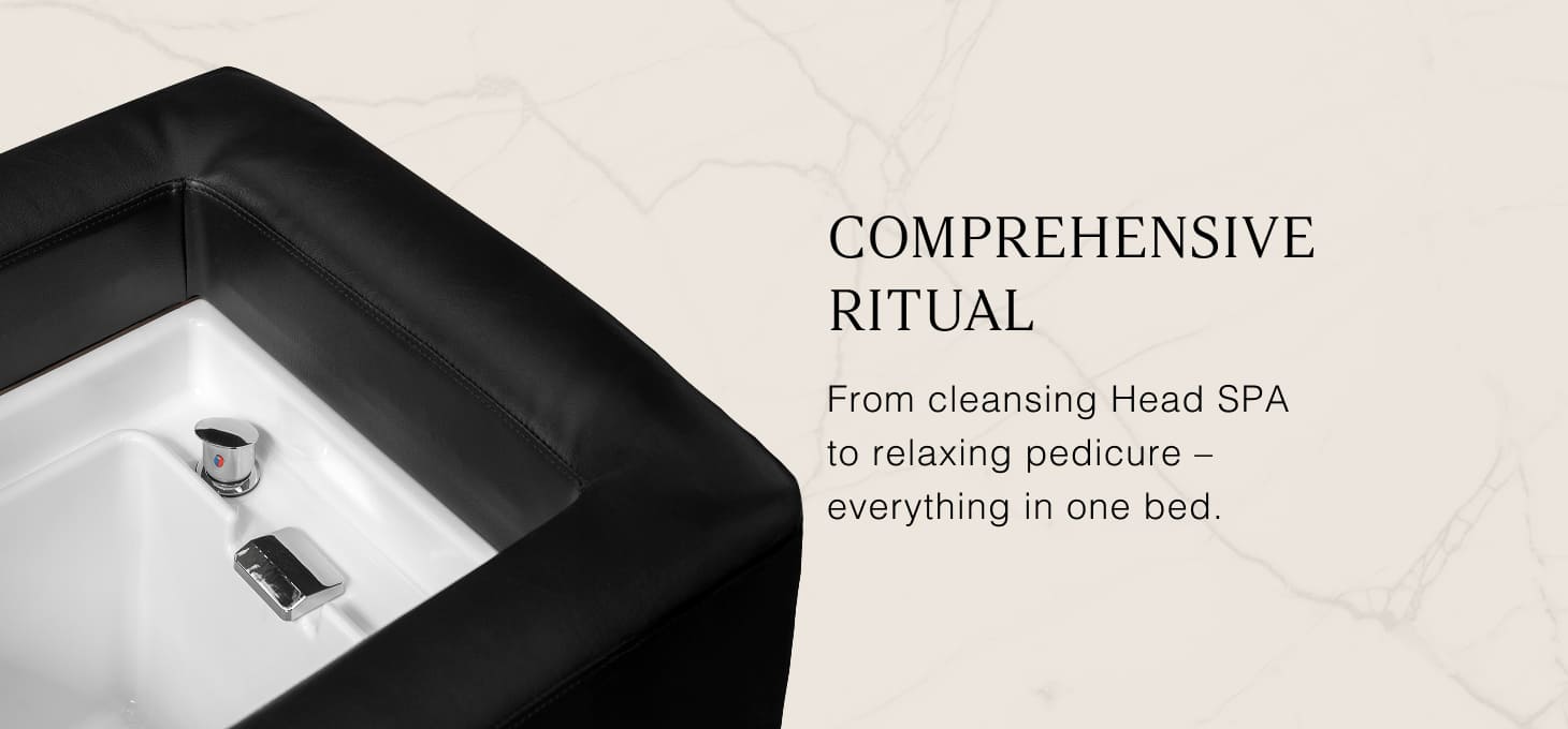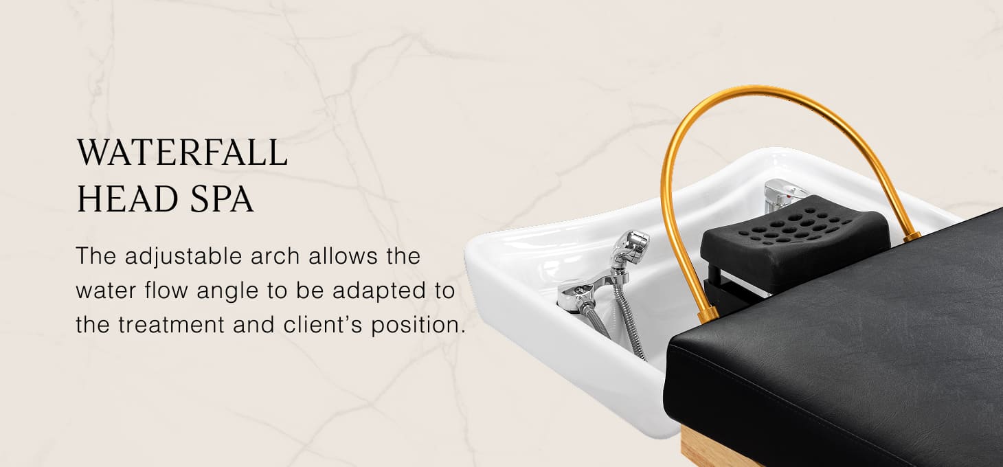 A special arch with an adjustable inclination creates a waterfall effect that intensively cleanses the scalp and acts as a natural massage, improving blood circulation, reducing tension and stress. Precisely controlled water flow promotes hair regeneration and intensely moisturises the skin. The adjustable waterfall provides a deep cleansing of the scalp and relaxation, providing relief from ailments such as headaches and neck stiffness. Thanks to an intelligent closed-loop system, the arch draws water from the basin and reuses it, providing a continuous water massage.