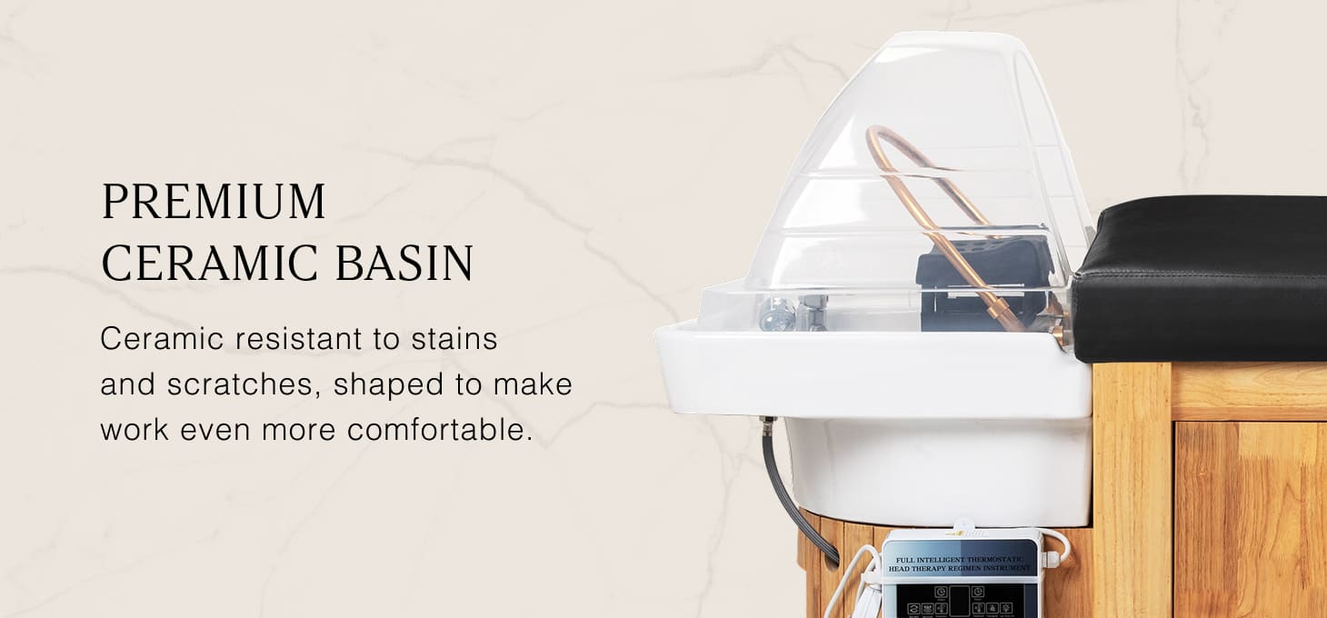 A deep ceramic bowl in shades of white effectively reduces splashing of water and products used during treatments, ensuring cleanliness and comfort of work. Made of durable material, the bowl is resistant to discolouration, scratches and damage, and its smooth surface makes cleaning exceptionally easy. Its distinctive profile not only facilitates access for the person performing the service but also gives the wash unit an elegant and modern look. The combination of aesthetics and functionality elevates the standard of any professional space.
