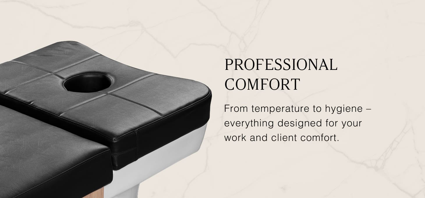 The adjustable headrest with extendable and adjustable tilt angle ensures a perfect fit for the user, enhancing comfort during treatments. The set includes ergonomic cushions, including a headrest with a face opening, which allows for not only scalp treatments but also massages and a variety of body and facial treatments. The built-in basin expands the functionality of the lounger, allowing for foot care treatments, including pedicures. This solution further enhances the feeling of relaxation and allows for an even more comprehensive range of services. These practical features make the bed a versatile piece of equipment for beauty and wellness salons, ensuring both client comfort and the effectiveness of treatments performed.