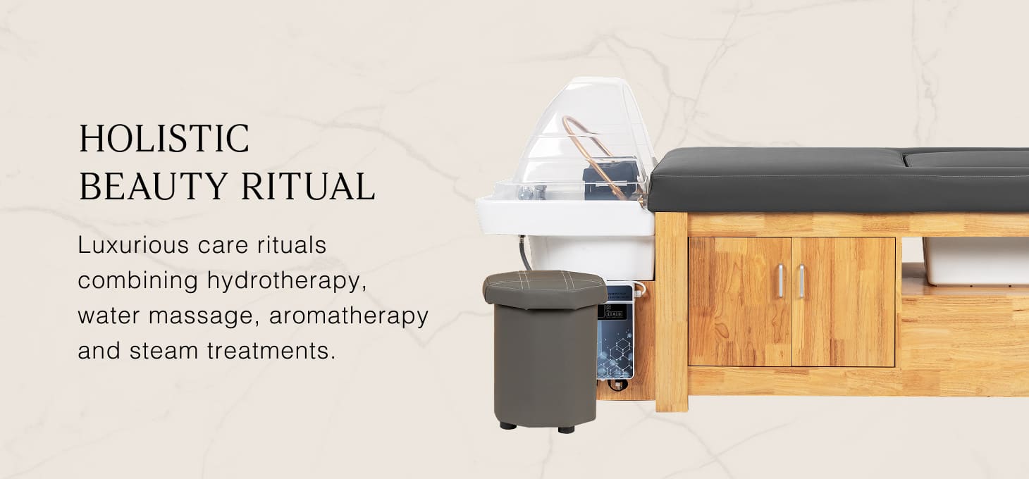 The elegant Gabbiano Head Spa Bali bed with integrated wash is an innovative solution for luxurious beauty and relaxation treatments. It is perfect for Japanese Head SPAs, hydrotherapy, water massage, aromatherapy, and steam therapy, providing a holistic experience. It also works well for body massages, offering versatile therapeutic and relaxing options. Advanced technology and ergonomic design not only provide unparalleled comfort for customers but also facilitate the work of beauty and wellness professionals. The combination of a natural wooden structure with soft grey upholstery gives the whole thing an elegant look and guarantees comfort of use