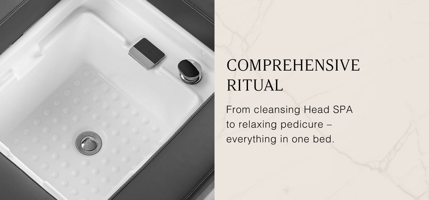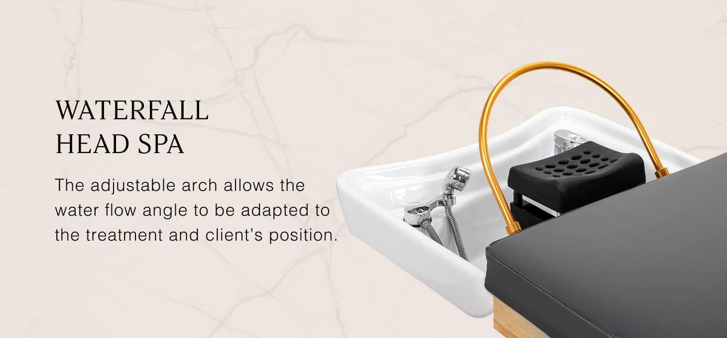 A special arch with an adjustable inclination creates a waterfall effect that intensively cleanses the scalp and acts as a natural massage, improving blood circulation, reducing tension and stress. Precisely controlled water flow promotes hair regeneration and intensely moisturises the skin. The adjustable waterfall provides a deep cleansing of the scalp and relaxation, providing relief from ailments such as headaches and neck stiffness. Thanks to an intelligent closed-loop system, the arch draws water from the basin and reuses it, providing a continuous water massage.
