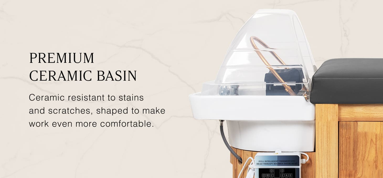 A deep ceramic bowl in shades of white effectively reduces splashing of water and products used during treatments, ensuring cleanliness and comfort of work. Made of durable material, the bowl is resistant to discolouration, scratches and damage, and its smooth surface makes cleaning exceptionally easy. Its distinctive profile not only facilitates access for the person performing the service but also gives the wash unit an elegant and modern look. The combination of aesthetics and functionality elevates the standard of any professional space.