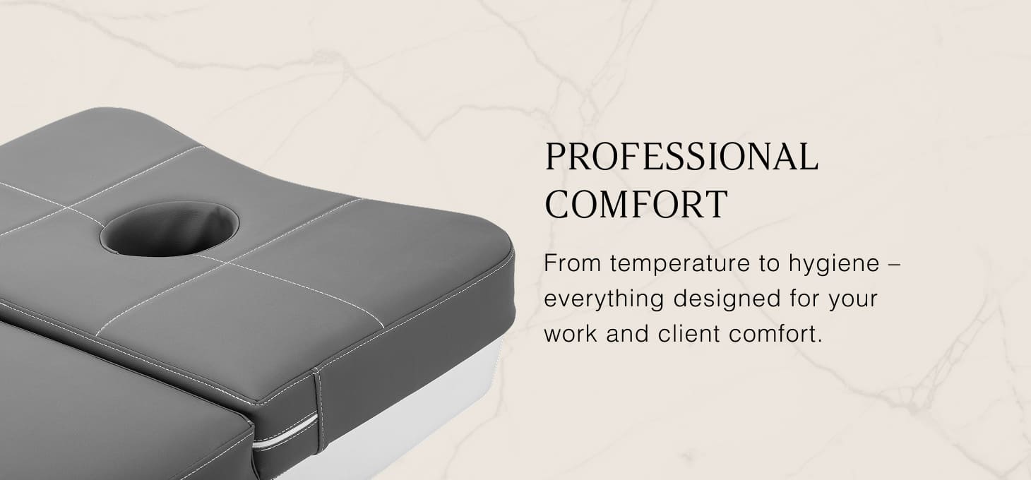 The adjustable headrest with extendable and adjustable tilt angle ensures a perfect fit for the user, enhancing comfort during treatments. The set includes ergonomic cushions, including a headrest with a face opening, which allows for not only scalp treatments but also massages and a variety of body and facial treatments. The built-in basin expands the functionality of the lounger, allowing for foot care treatments, including pedicures. This solution further enhances the feeling of relaxation and allows for an even more comprehensive range of services. These practical features make the bed a versatile piece of equipment for beauty and wellness salons, ensuring both client comfort and the effectiveness of treatments performed.