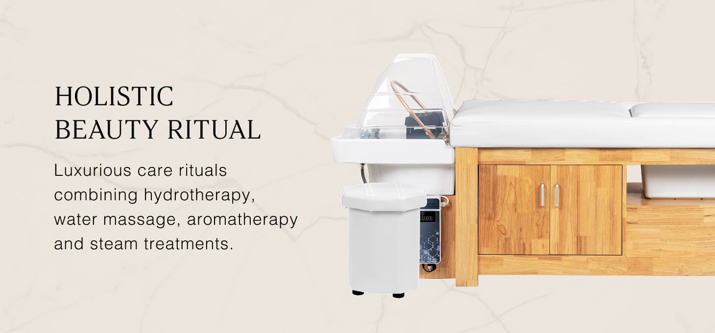 The elegant Gabbiano Head Spa Bali bed with integrated wash is an innovative solution for luxurious beauty and relaxation treatments. It is perfect for Japanese Head SPAs, hydrotherapy, water massage, aromatherapy, and steam therapy, providing a holistic experience. It also works well for body massages, offering versatile therapeutic and relaxing options. Advanced technology and ergonomic design not only provide unparalleled comfort for customers but also facilitate the work of beauty and wellness professionals. The combination of a natural wooden structure with soft white upholstery gives the whole thing an elegant look and guarantees comfort of use.
