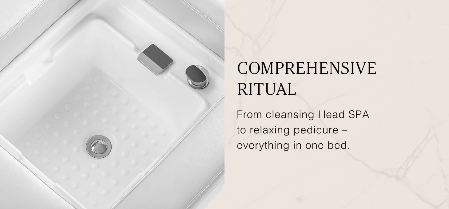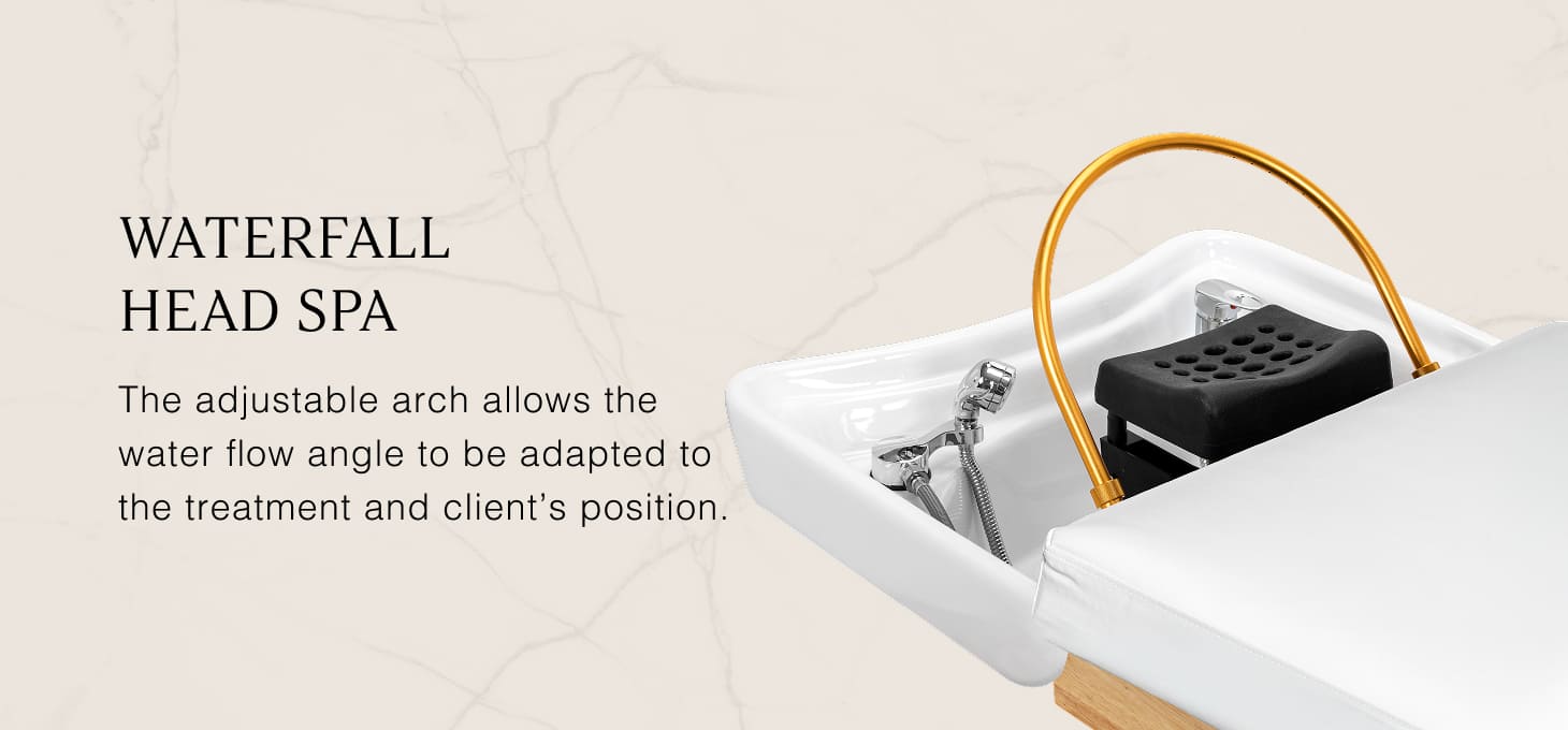 A special arch with an adjustable inclination creates a waterfall effect that intensively cleanses the scalp and acts as a natural massage, improving blood circulation, reducing tension and stress. Precisely controlled water flow promotes hair regeneration and intensely moisturises the skin. The adjustable waterfall provides a deep cleansing of the scalp and relaxation, providing relief from ailments such as headaches and neck stiffness. Thanks to an intelligent closed-loop system, the arch draws water from the basin and reuses it, providing a continuous water massage.