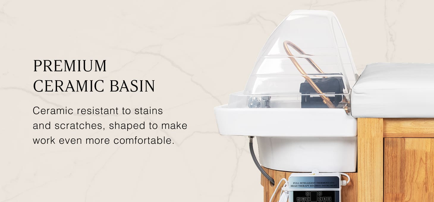 A deep ceramic bowl in shades of white effectively reduces splashing of water and products used during treatments, ensuring cleanliness and comfort of work. Made of durable material, the bowl is resistant to discolouration, scratches and damage, and its smooth surface makes cleaning exceptionally easy. Its distinctive profile not only facilitates access for the person performing the service but also gives the wash unit an elegant and modern look. The combination of aesthetics and functionality elevates the standard of any professional space.