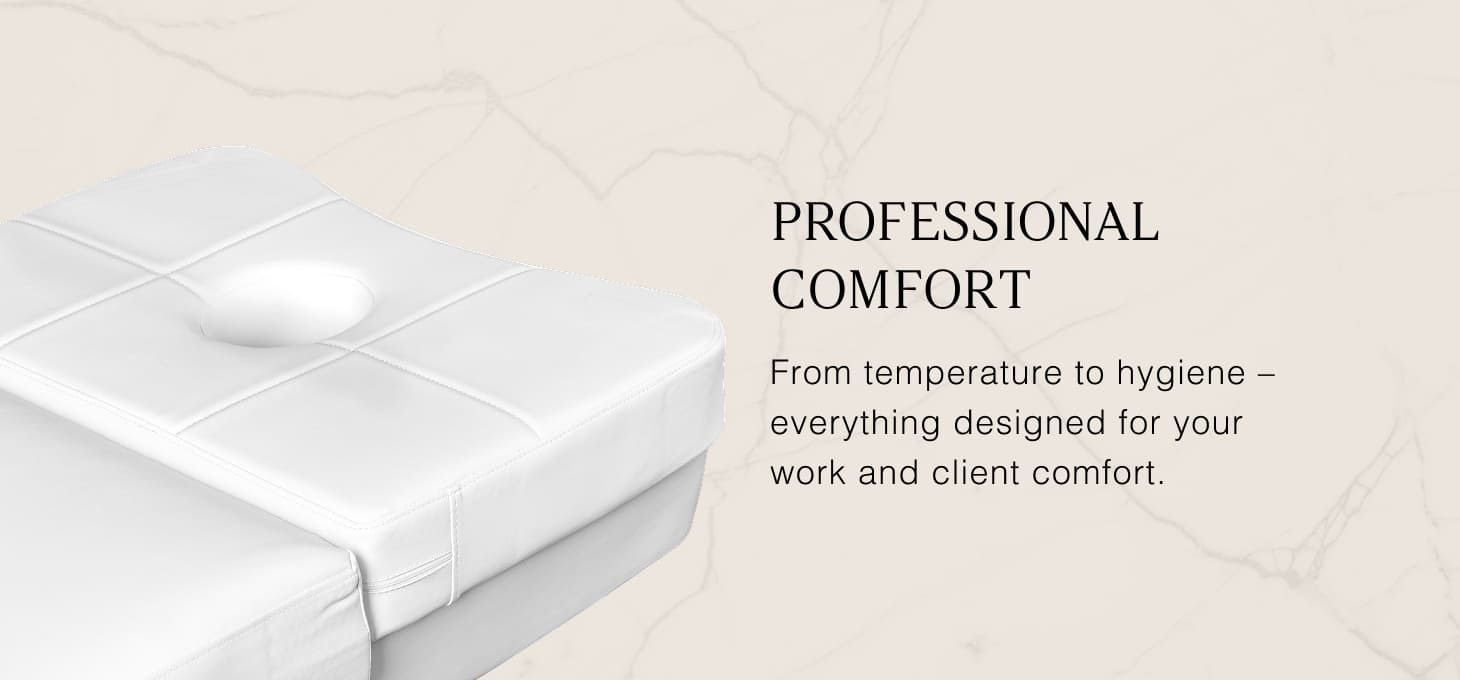 The adjustable headrest with extendable and adjustable tilt angle ensures a perfect fit for the user, enhancing comfort during treatments. The set includes ergonomic cushions, including a headrest with a face opening, which allows for not only scalp treatments but also massages and a variety of body and facial treatments. The built-in basin expands the functionality of the lounger, allowing for foot care treatments, including pedicures. This solution further enhances the feeling of relaxation and allows for an even more comprehensive range of services. These practical features make the bed a versatile piece of equipment for beauty and wellness salons, ensuring both client comfort and the effectiveness of treatments performed.
