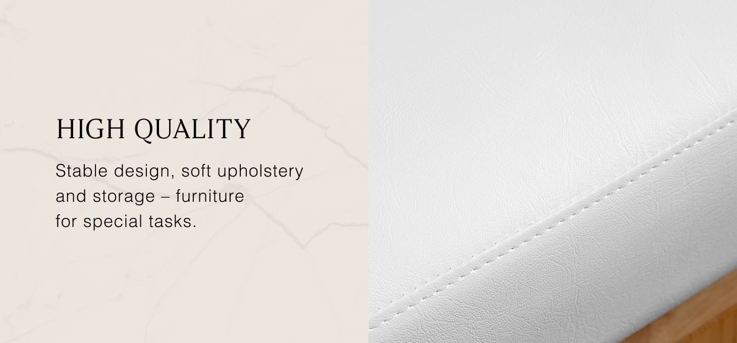 The Head Spa Bali bed is a harmonious combination of functionality and modern design. Its stable structure is reinforced by a solid frame finished with aesthetically pleasing wooden elements, which add warmth and elegance to the interior. The robust construction guarantees stability and durability for long-term use. The ergonomically profiled lounger surface is covered with soft synthetic leather in shades of elegant white, ensuring maximum comfort during treatments and at the same time makes it easy to keep clean. A practical cabinet located under the lounger allows for convenient storage of cosmetics and accessories, ensuring all necessary products are always within reach. The combination of natural wood, soft synthetic leather and ergonomic design makes the Head Spa Bali a stylish and functional piece of furniture for hair salons, SPAs and wellness centres. It is designed to combine comfort of use with a timeless aesthetic.