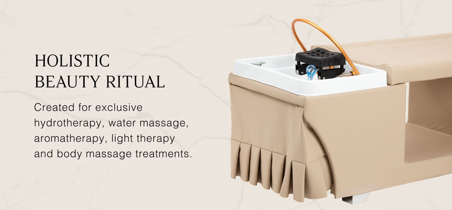 The elegant Gabbiano Head Spa Maldives bed with integrated wash unit is an innovative solution designed for professional care and relaxation treatments. It is perfect for luxurious Japanese Head Spa rituals, expanding the salon's offer with a wide range of scalp and hair therapies. It combines hydrotherapy techniques, water massage, aromatherapy, and light therapy techniques, offering a comprehensive and holistic experience. Advanced technologies combined with an ergonomic design guarantee exceptional comfort for customers and facilitate the work of beauty and wellness professionals. The Gabbiano Head Spa Maldives combines tradition with modernity, providing deep relaxation, nourishment and hydration of the scalp and hair. It can also be used for body massage, making it a versatile therapeutic and relaxation tool.