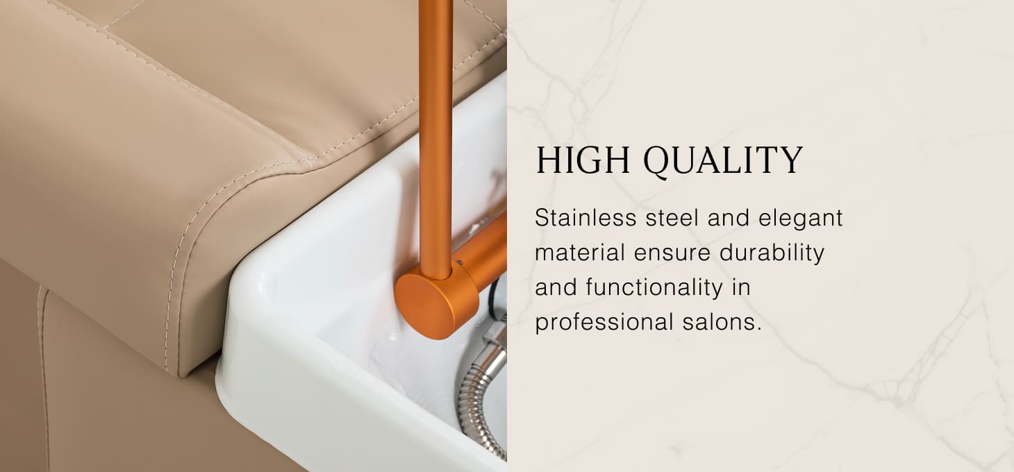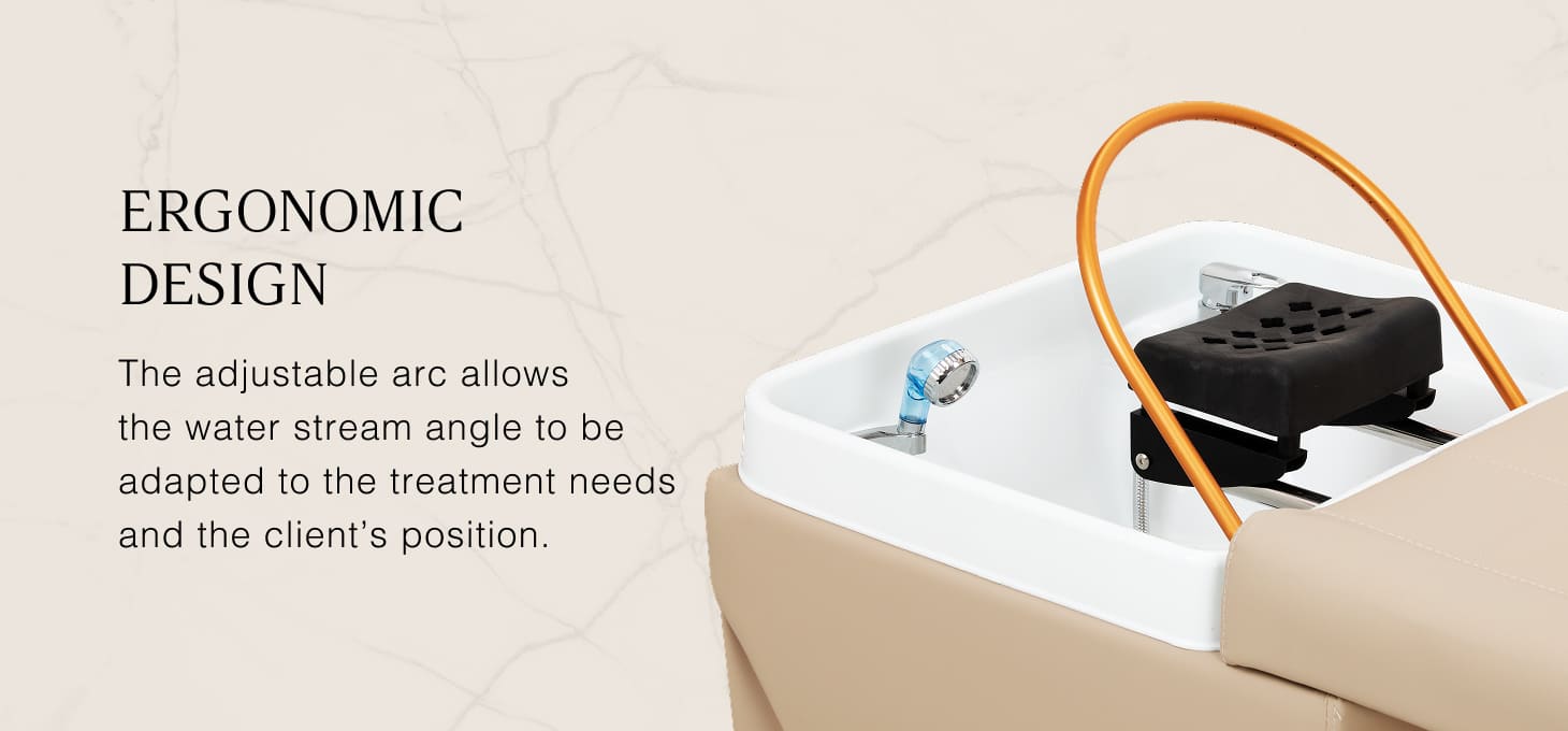 The golden arch with an adjustable inclination angle, designed for the Waterfall Head SPA, is an innovative solution that enables comprehensive scalp care. Water jets act as a natural massage, improving blood circulation, reducing tension and stress, and bringing relief from ailments such as headaches and neck stiffness. Precisely controlled water flow promotes hair regeneration and intensely moisturises the skin. Thanks to an intelligent closed-loop system, the arch draws water from the basin and reuses it, providing a continuous water massage. A combination of technology and relaxation that supports hair health and well-being.