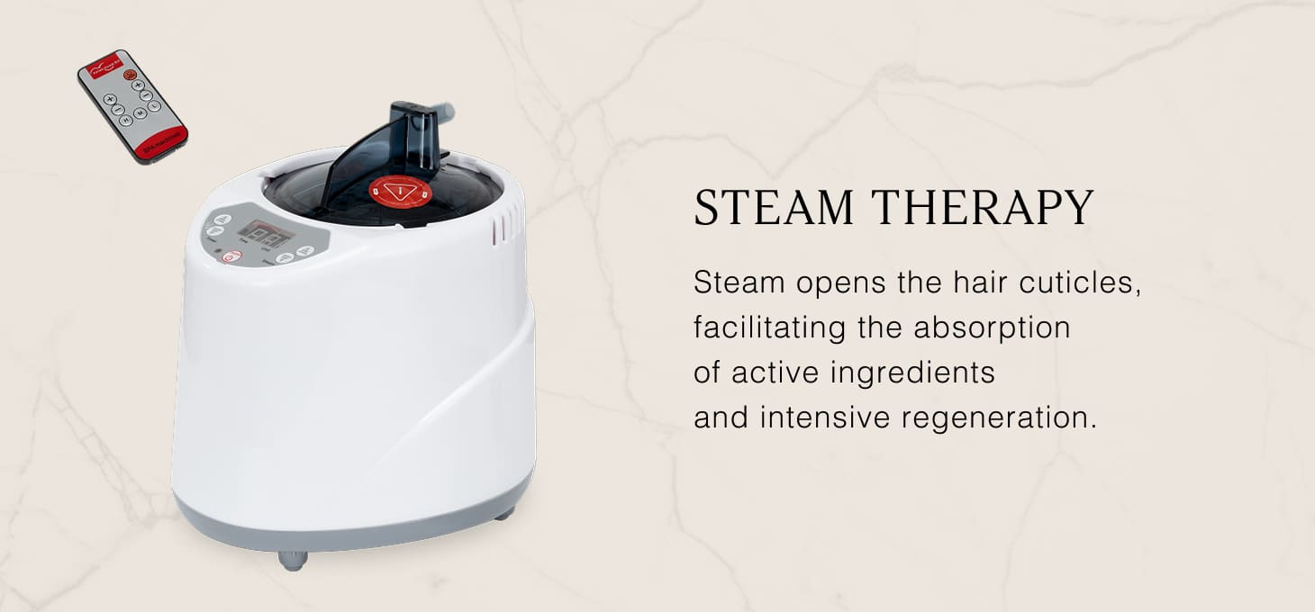 The set includes a specialised steam-generating device and a dedicated sink cover that allows for precise treatment. This modern care method uses the properties of steam to intensively regenerate and moisturise hair. This allows the active ingredients contained in masks, ampoules and other products to penetrate deeper, supporting hair repair and strengthening. Steam therapy improves hair structure, increases resistance to damage and restores a healthy shine, making hair soft, supple and full of life.