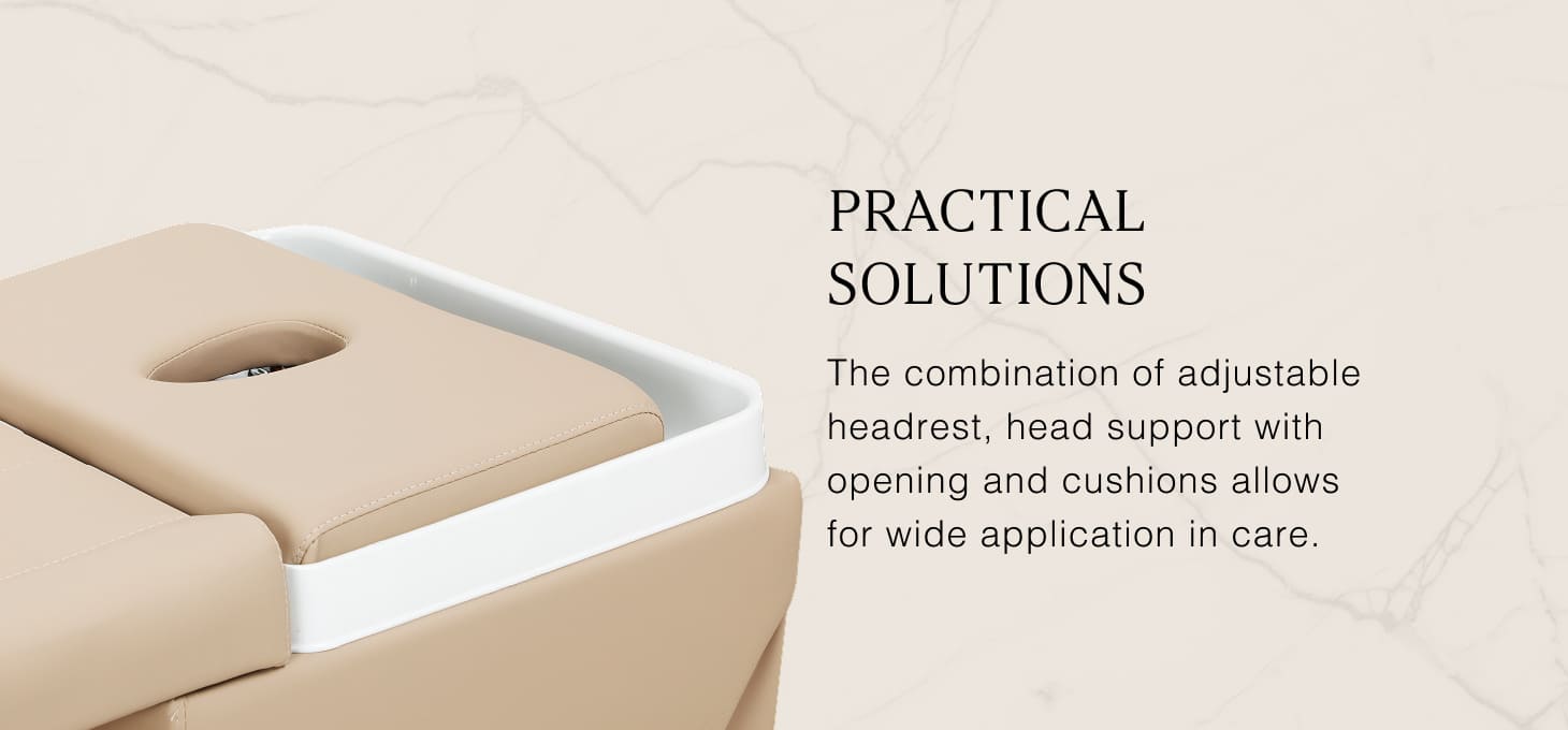 The wash unit is equipped with a mixer tap, allowing for precise adjustment of water temperature to the client's needs. A dedicated space for the shower head improves efficiency, while a chrome-plated plug with a special strainer ensures water flow control and maintains a high level of hygiene. The water connection is located inside the base, behind the fabric, aesthetically concealing the plumbing and giving the entire unit an elegant look. The ergonomically contoured bed ensures comfort during various beauty treatments. A practical pouffe complements the unit, increasing staff comfort and enhancing the functionality of the unit. These features make the wash unit ideal for both hair and SPA salons.