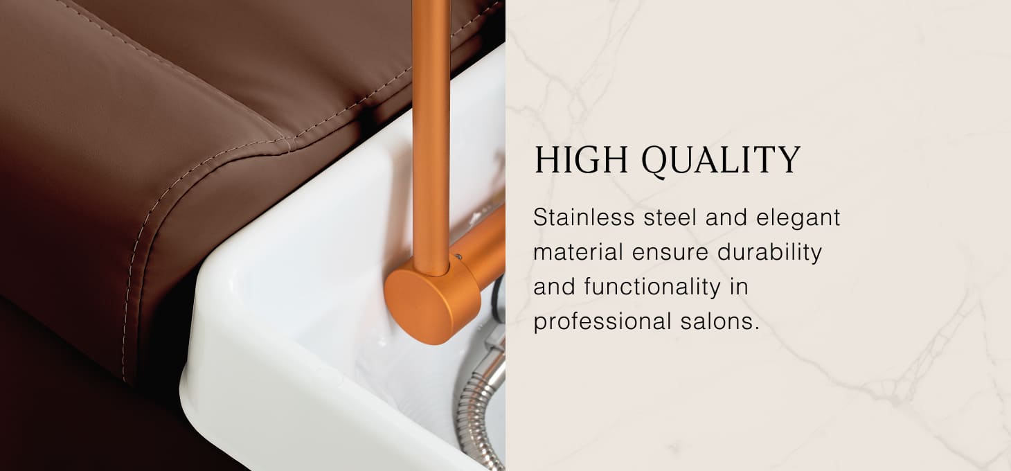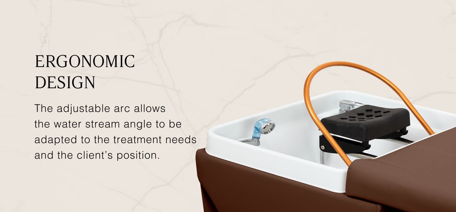 The golden arch with an adjustable inclination angle, designed for the Waterfall Head SPA, is an innovative solution that enables comprehensive scalp care. Water jets act as a natural massage, improving blood circulation, reducing tension and stress, and bringing relief from ailments such as headaches and neck stiffness. Precisely controlled water flow promotes hair regeneration and intensely moisturises the skin. Thanks to an intelligent closed-loop system, the arch draws water from the basin and reuses it, providing a continuous water massage. A combination of technology and relaxation that supports hair health and well-being