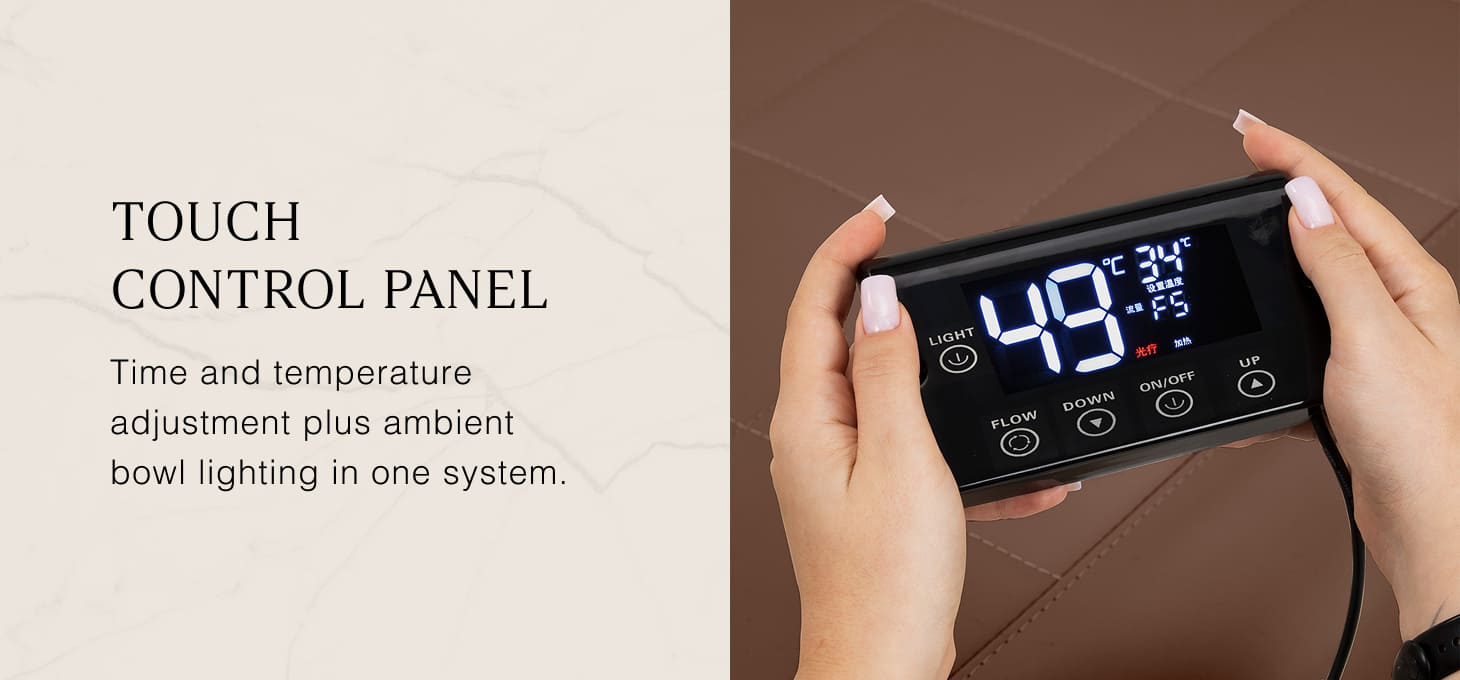 The intuitive touch panel allows for full control over treatment parameters and ease of use. It allows you to adjust the operating time and water temperature, as well as monitor their current values on a clear, easy-to-read display. Additionally, the panel allows you to activate the light therapy function, which illuminates the bowl, creating an atmosphere of relaxation and luxury. The set also includes a remote control, which allows you to conveniently control the steam therapy device from a distance.