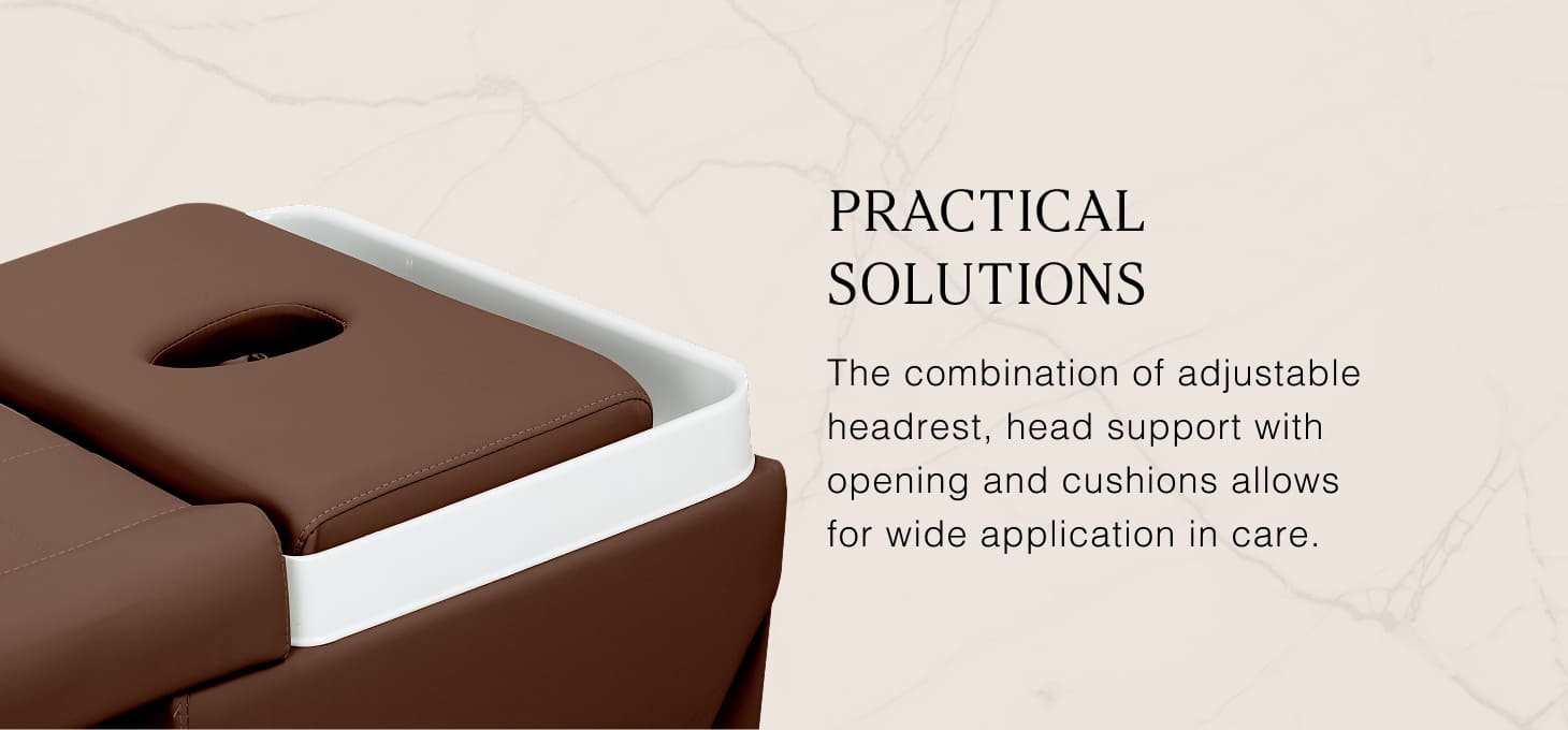 The Head Spa Maldives bed combines functionality with modern design. A sturdy frame, upholstered in elegant synthetic leather, ensures a stable structure. The ergonomically profiled surface in shades of brown, covered with soft fabric, guarantees complete comfort during treatments. The additional space under the lounger allows for convenient storage of accessories, towels, and cosmetics, making it a practical and stylish addition to any professional beauty and wellness salon.