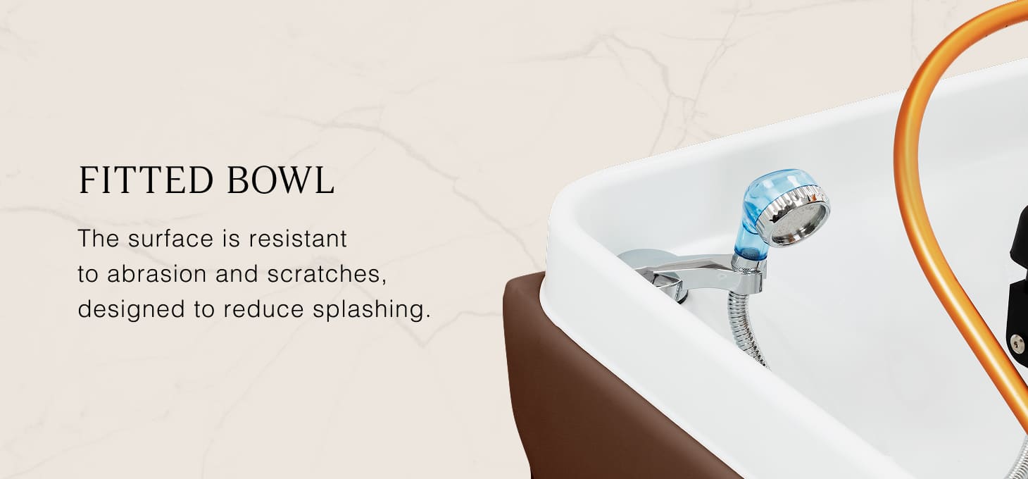 The wash unit is equipped with a mixer tap, allowing for precise adjustment of water temperature to the client's needs. A dedicated space for the shower head improves efficiency, while a chrome-plated plug with a special strainer ensures water flow control and maintains a high level of hygiene. The water connection is located inside the base, behind the fabric, aesthetically concealing the plumbing and giving the entire unit an elegant look. The ergonomically contoured bed ensures comfort during various beauty treatments. A practical pouffe complements the unit, increasing staff comfort and enhancing the functionality of the unit. These features make the wash unit ideal for both hair and SPA salons.