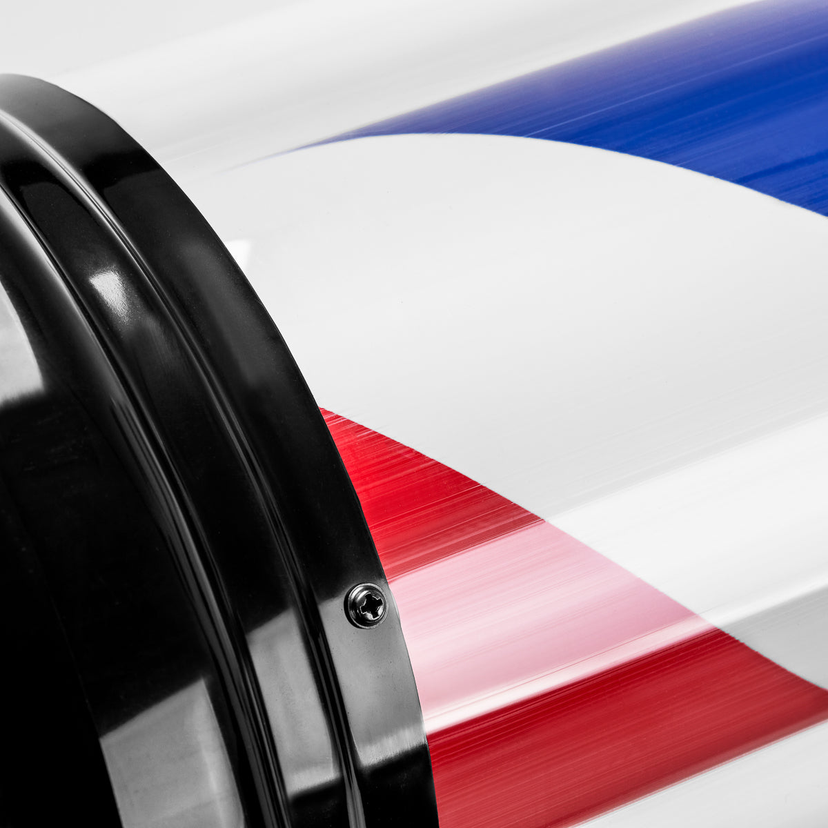 Ein auffälliger beleuchteter Plafond, ausgestattet mit einem rotierenden Zylinder, ist eine ausgezeichnete Werbung für einen Friseursalon. Das markante Design mit rotierenden Elementen in Rot, Weiß und Blau schafft eine einzigartige, international verständliche Visitenkarte des Friseursalons. Mit der kabelgebundenen Fernbedienung können sowohl die Beleuchtung als auch die Rotation des Plafonds eingeschaltet werden.