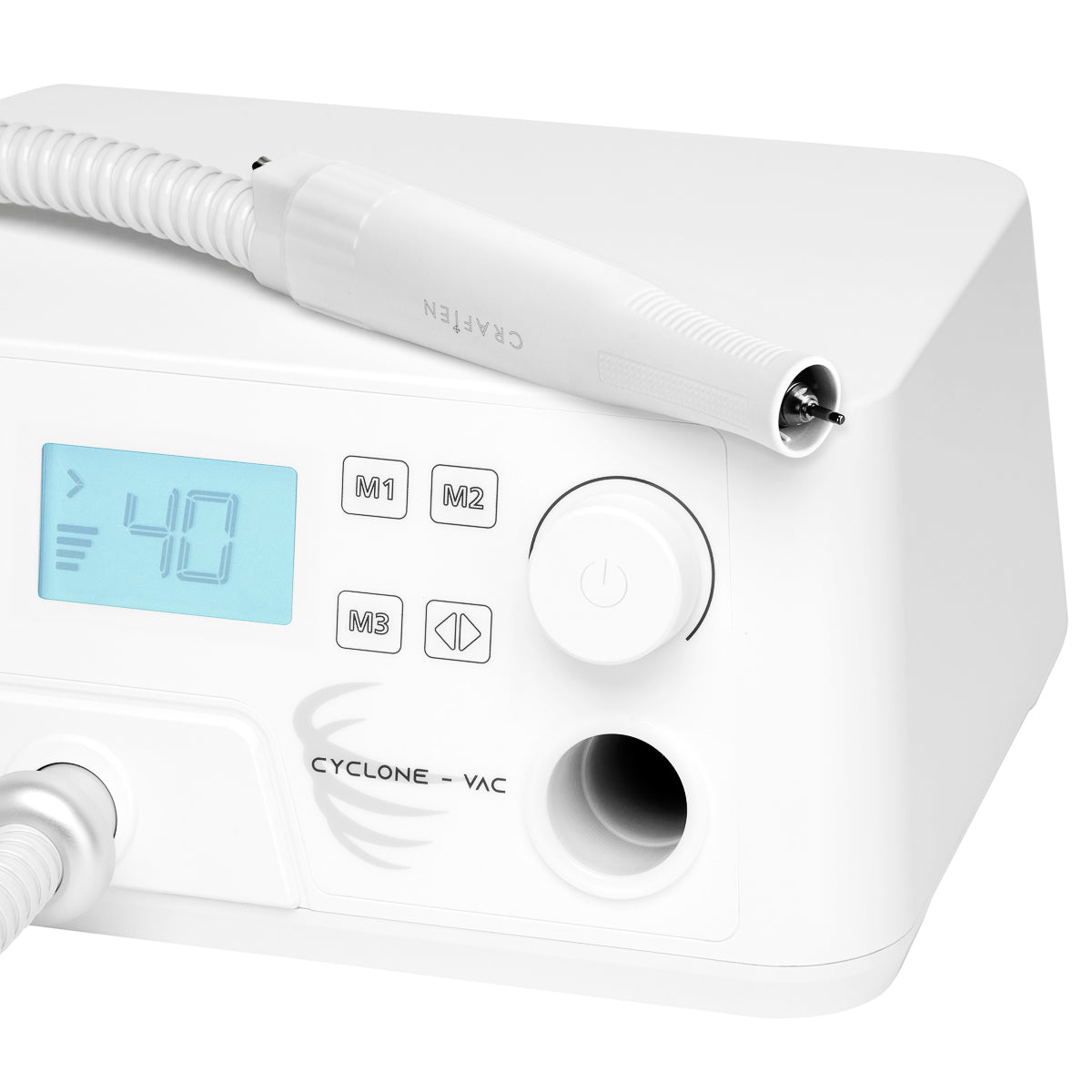 Ästhetisches, futuristisches Design in Weißtönen fügt sich perfekt in jedes Interieur ein. Ein spezieller Platz zum Ablegen des Kopfes ermöglicht wesentlich komfortableres Arbeiten, und rutschfeste Füße sorgen für Stabilität des Geräts während der Nutzung. Die Saeyang Cyclone-Vac Nagelfräse mit Absorber wird mit 12 Monaten Garantie geliefert.