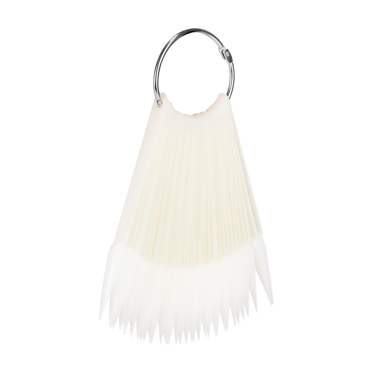 Die Nagelschablone in milchiger Farbe ermöglicht es Ihnen, alle Farben klassischer und hybrider Lacke oder Gele ästhetisch zu präsentieren. Sie besteht aus 50 einzelnen Spitzen mit spitzer Form. Sie wird mit einem praktischen, abnehmbaren Rad befestigt, was das einfache Verstauen des gesamten Sets ermöglicht. Jede Spitze besteht aus langlebigem Kunststoff.