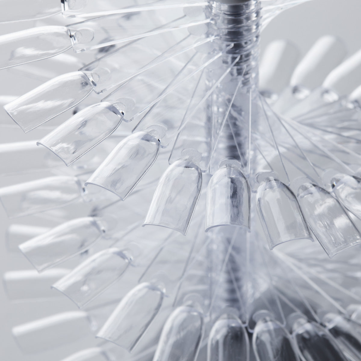 Die Schablone ermöglicht eine interessante und ästhetische Präsentation aller Farben klassischer und hybrider Lacke oder Gele. Sie besteht aus 30 transparenten Stäbchen, die jeweils an beiden Enden mit einer quadratisch abgeschrägten Spitze versehen sind. Jede Spitze ist aus langlebigem Kunststoff gefertigt. Die Schablone lässt sich leicht zusammenfalten für eine einfache Aufbewahrung des gesamten Sets.