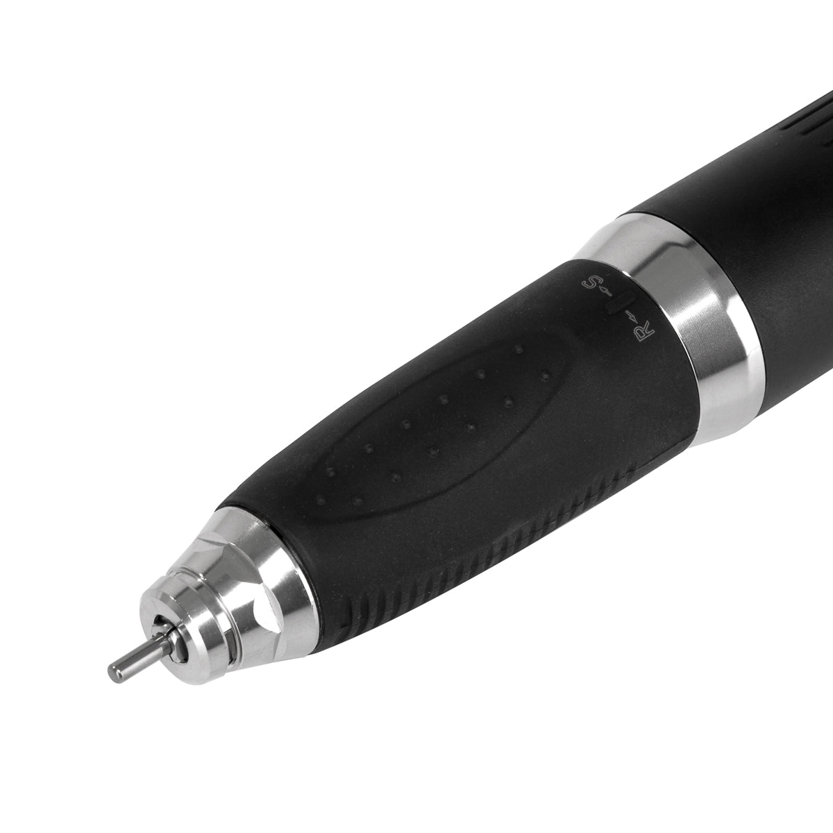 Mit dem Drehknopf können Sie die Geschwindigkeit des Kopfes bis zu 50.000 Umdrehungen pro Minute einstellen, und die aktuelle Geschwindigkeit wird auf einem digitalen Display angezeigt. Dies ermöglicht eine effiziente Anpassung an individuelle Bedürfnisse und komfortable Durchführung einer Vielzahl von Behandlungen. Die Tasten erlauben ein schnelles Umschalten auf den Fußantrieb, das Ändern der Drehrichtung und das Anhalten des Geräts (Pause-Funktion), was volle Kontrolle über die Nagelfräse bietet und die Anpassung des Betriebs an die durchgeführten Leistungen erleichtert. LED-Anzeigen informieren über den Gerätestatus, zeigen die Drehrichtung, die Aktivierung des Fußantriebs, das Einschalten der Auto-Cruise-Funktion und die Pause an. Die Bedienung des Geräts ist einfach, effizient und intuitiv, was von anspruchsvolleren Nutzern sicherlich geschätzt wird.
