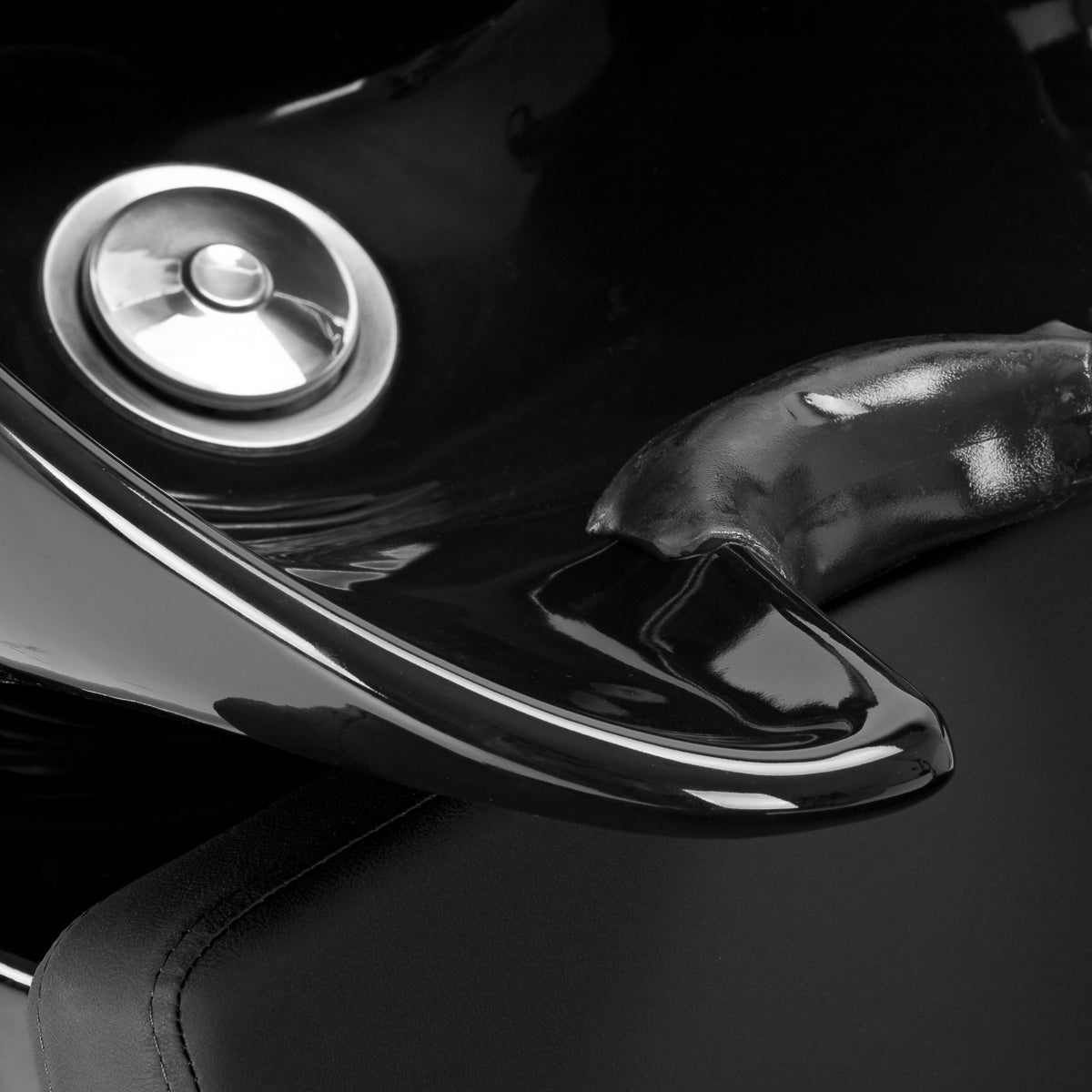 Der geometrisch geformte Stuhl vereint moderne Schlichtheit mit Nutzungskomfort. Sitz und Armlehnen mit sanften Winkeln bilden ein harmonisches Ganzes und gewährleisten eine bequeme Haltung während der Behandlung, während die Rückenlehne mit optimalem Neigungswinkel eine korrekte Haltung unterstützt und zur Entspannung beiträgt. Die hochwertige Polsterung aus Kunstleder in Schwarztönen ist gebrauchs- und feuchtigkeitsbeständig sowie leicht zu reinigen. Die schlichte, moderne Form der Möbel unterstreicht den eleganten Charakter des Waschplatzes, und die vollständige Ausstattung – Hahn, Duschkopf und spezielle Schläuche – bietet ein komplettes Arbeitswerkzeugset.