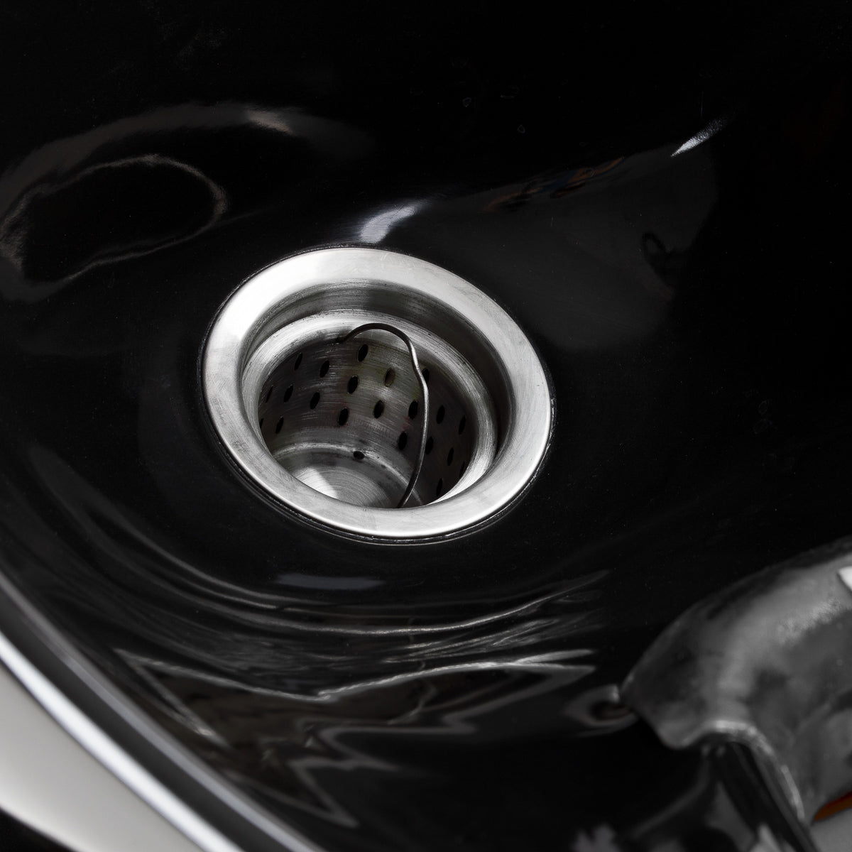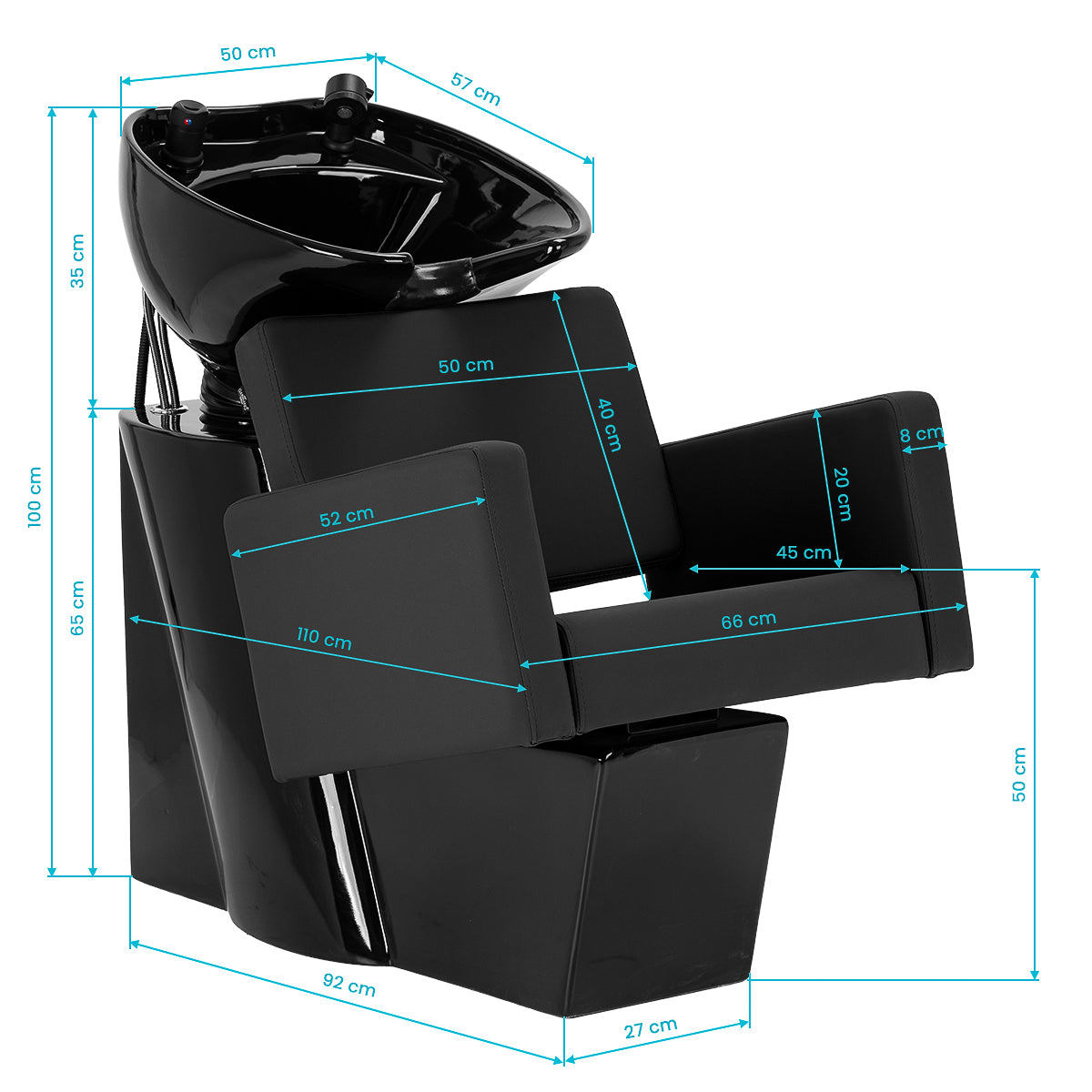 Die tiefe Keramikschale in Schwarztönen verringert das Spritzen von Wasser und Pflegeprodukten während der Behandlung. Der verstellbare Winkel der Schale ermöglicht eine genaue Anpassung an die Bedürfnisse der Kundin. Aus widerstandsfähigem Material gefertigt, ist sie beständig gegen Verfärbungen, Kratzer und Chemikalien, und ihre glatte Oberfläche erleichtert die Reinigung. Der ergonomisch geformte Nackenstützkragen bietet bequeme Kopfunterstützung, und die schwarze Kunststoffabdeckung nimmt die Kälte beim Kontakt mit der Keramik.