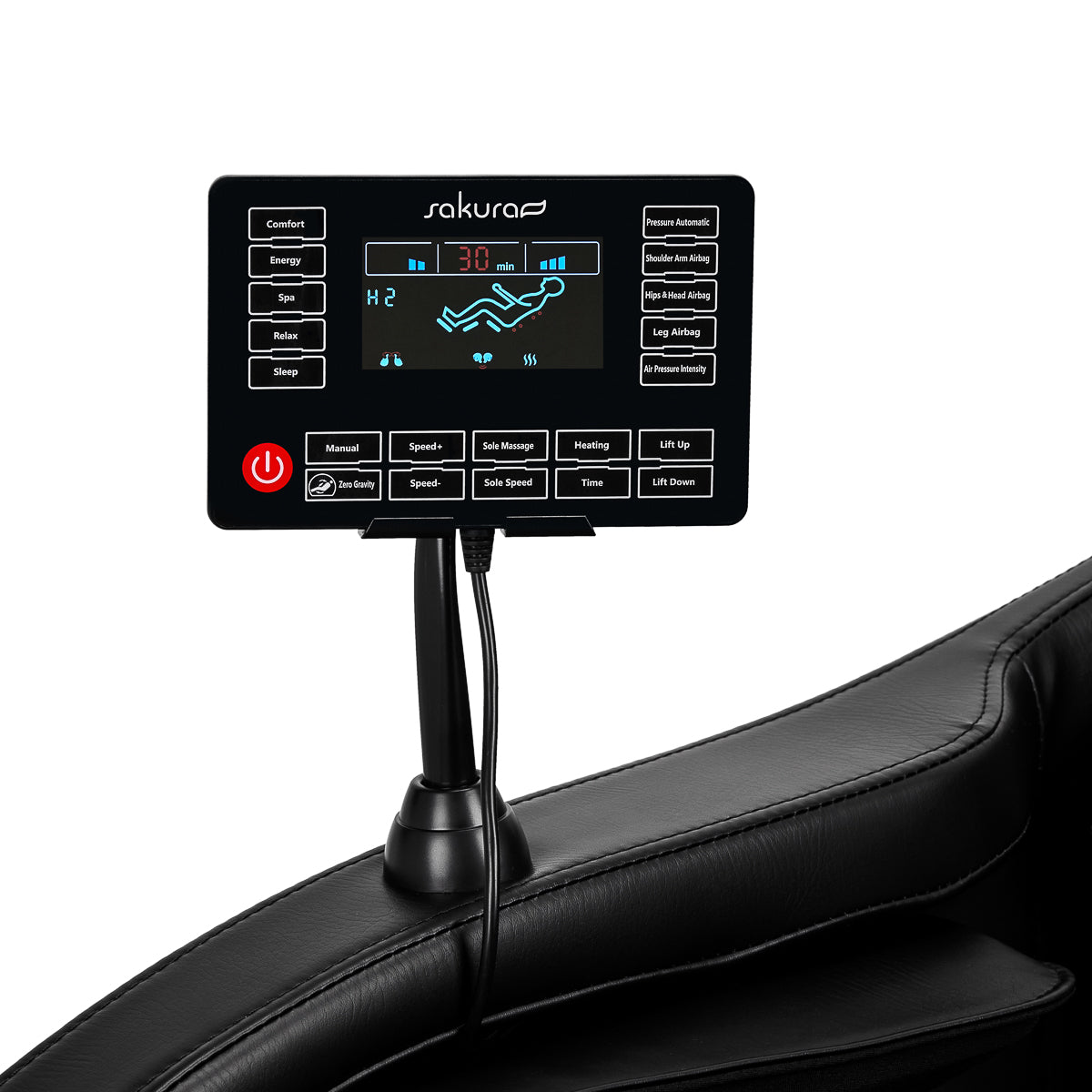 Mit dem transparenten Bedienfeld – das am Griff an der rechten Armlehne angebracht oder in der Hand gehalten werden kann – ist die Nutzung des Sessels einfach und angenehm. Sie können den Betrieb des Geräts auf dem klaren LCD-Bildschirm verfolgen. Die aktuell massierten Körperbereiche, die Intensität der Behandlung, die Servicezeit und das ausgewählte Programm werden deutlich angezeigt. Das Panel ermöglicht es Ihnen, die Einstellungen des Sessels und der Massagefunktionen frei anzupassen sowie die Behandlungsdauer einzustellen, die 5, 10, 15, 20, 25 oder 30 Minuten betragen kann.