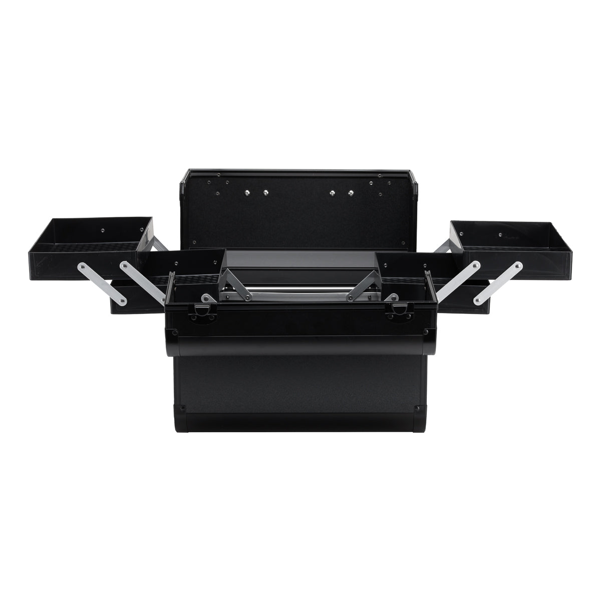 Das moderne Design mit glatten, schwarz lackierten Wänden und metallischen Akzenten verleiht einen Hauch von Eleganz. Der Griff erleichtert den Transport, was besonders für mobile Stylisten wichtig ist. Hergestellt aus langlebigen, schadenresistenten Materialien, gewährleistet es den täglichen Nutzungskomfort. Ein stabiler Verschluss mit Schlüssel schützt den Inhalt, während die leichte und robuste Konstruktion das Case einfach zu tragen macht.