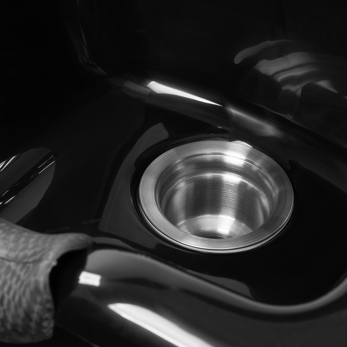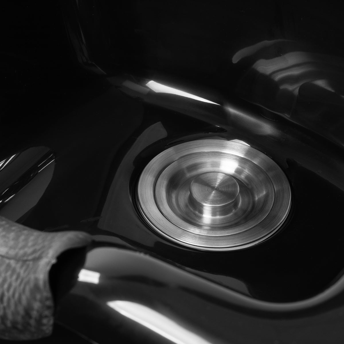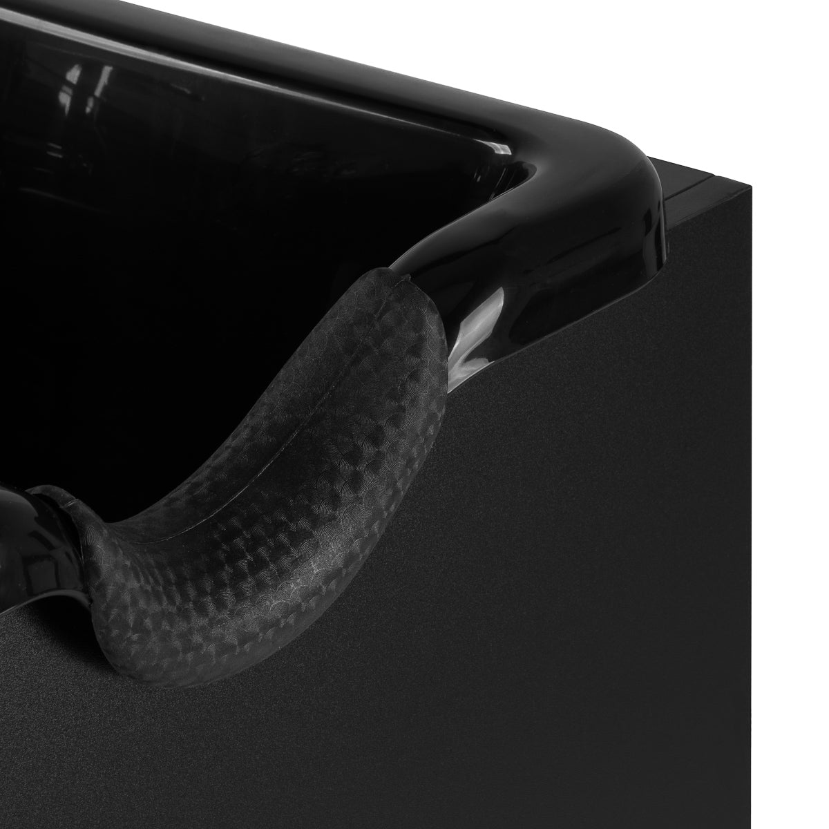 Die tiefschwarze Schale besteht aus robustem Kunststoff, was sie beschädigungsresistent und leicht zu reinigen macht. Ihr durchdachtes Design reduziert effektiv das Spritzen von Wasser und Pflegeprodukten während des Waschens. Die ergonomische Form und der profilierte Kragen mit Silikonüberzug bieten dem Kunden eine bequeme Kopfposition. Ein praktischer Platz für den Duschkopf hilft, die Station besser zu organisieren, und der Stöpsel mit Sieb erleichtert die Wasserflusskontrolle sowie die Sauberkeit und Hygiene.