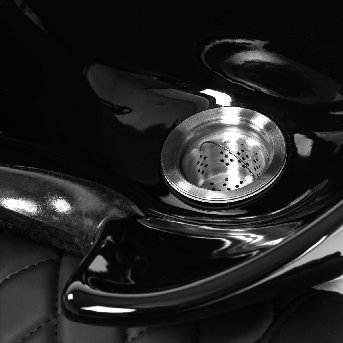 Die Tiefe der Keramikschüssel des Beckens in Schwarztönen ermöglicht komfortables und effektives Ausführen einer Vielzahl von Friseurdienstleistungen, verhindert übermäßiges Spritzen von Wasser und während der Behandlung verwendeten Produkten. Das verwendete Material macht das Waschbecken langlebig, widerstandsfähig gegen Verfärbungen und Kratzer und sehr leicht zu reinigen. Der entsprechend profilierte Rand und die geneigte Rückenlehne bieten Unterstützung und Komfort beim Haarewaschen, und dank der bequemen Kunststoffauflage in Schwarztönen verspürt der Kunde kein Unbehagen durch die kalte Keramikoberfläche.