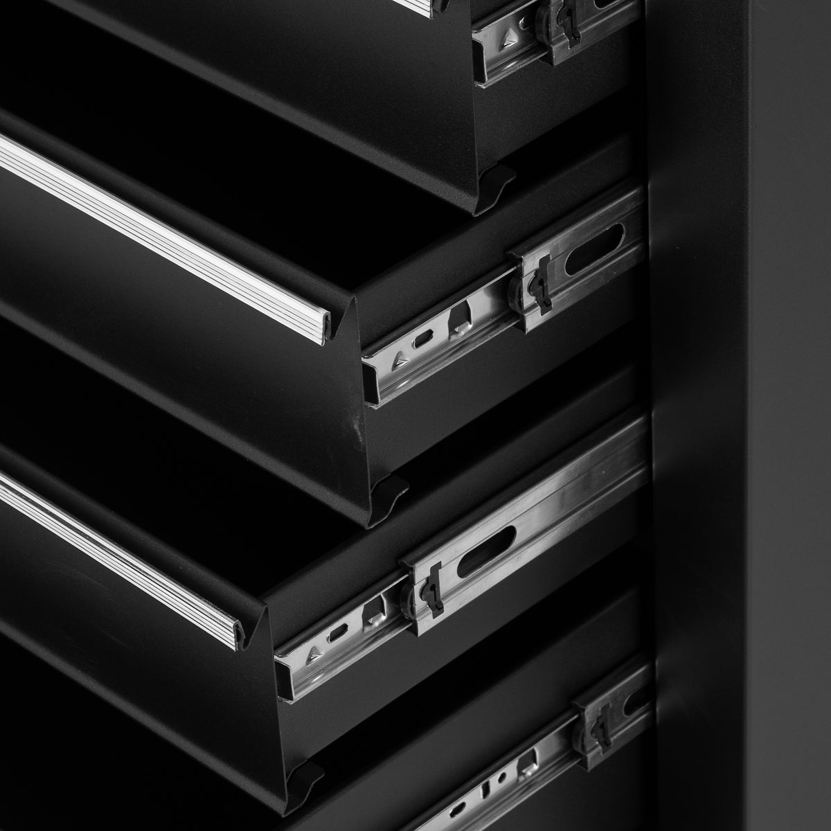 Das Modell ist mit fünf geräumigen Schubladen ausgestattet, die mit rutschfesten Matten ausgelegt sind, und es gibt ein zusätzliches Fach mit einer rutschfesten Matte oben drauf. Sie bieten eine sichere Aufbewahrung für Werkzeuge, Farben und Einwegzubehör ohne das Risiko des Verrutschens beim Öffnen oder Bewegen des Assistenten und fördern Ordnung und effiziente Arbeitsorganisation.